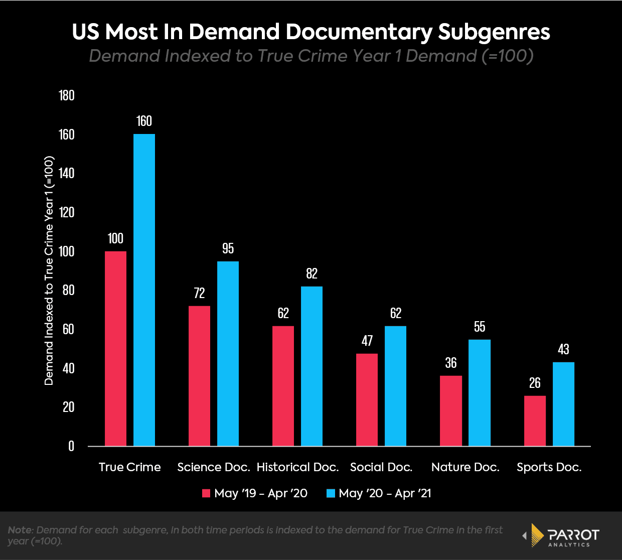 Expanding the scope beyond Netflix reveals similar trends throughout the industry. Parrot Analytics—a media-tracking company that measures audience demand with a formula that accounts for streams, search-engine traffic, illegal downloads, and social media—said in April that the documentary genre as a whole had become the fastest-growing segment of the streaming industry, with the number of series growing 63 percent between January 2018 and March 2021. In data prepared for The Ringer in May, Parrot revealed that true crime was not only the biggest documentary subgenre, but that it was also growing faster than nearly any of the others. (Interest in sports documentaries, which make up the smallest portion of the documentary market per Parrot’s data, grew slightly faster, though mostly all of that increase could be attributed to the popularity of the Michael Jordan docuseries The Last Dance.)