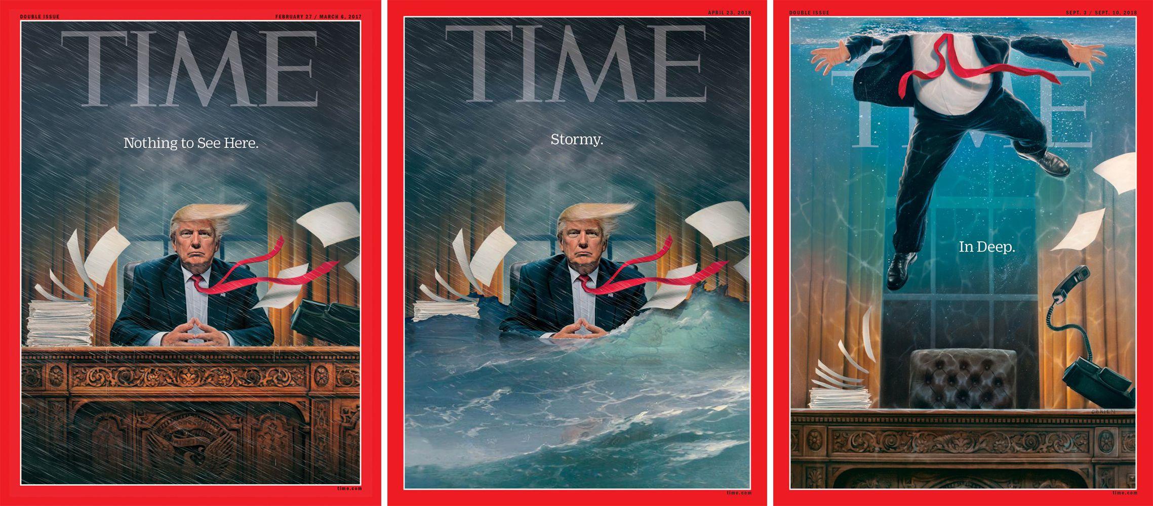 Time has maintained its famous red border (with few exceptions) since 1927, but what occupies that space in 2018 is decidedly more high concept. Take its September 3 cover: released during a week in which President Donald Trump was implicated in a criminal conspiracy, it depicts an illustration of the president’s lower torso—denoted by his signature ponch and thick, red tie—floating underwater in the Oval Office, with only the words “In Deep.” The magazine premiered an animated version of the image on Twitter before the print issue hit newsstands. From there, astute political observers noted that this was the third in a series of Time covers by illustrator Tim O’Brien depicting inclement weather in the presidential headquarters. And that observation was quickly volleyed into multiple blog posts delighting in the Easter egg. (“The ‘In Deep’ Trump ‘TIME’ Cover Is Even More Clever Than It Seems,” wrote Bustle.) In an era when the newsstand once reigned supreme, all this buzz for a teeny, two-word coverline and a floating presidential torso would’ve been hard to fathom. But in 2018, Time knows exactly where and how to get readers’ attention, and then hopefully how to turn that attention into a tangible collector’s item.