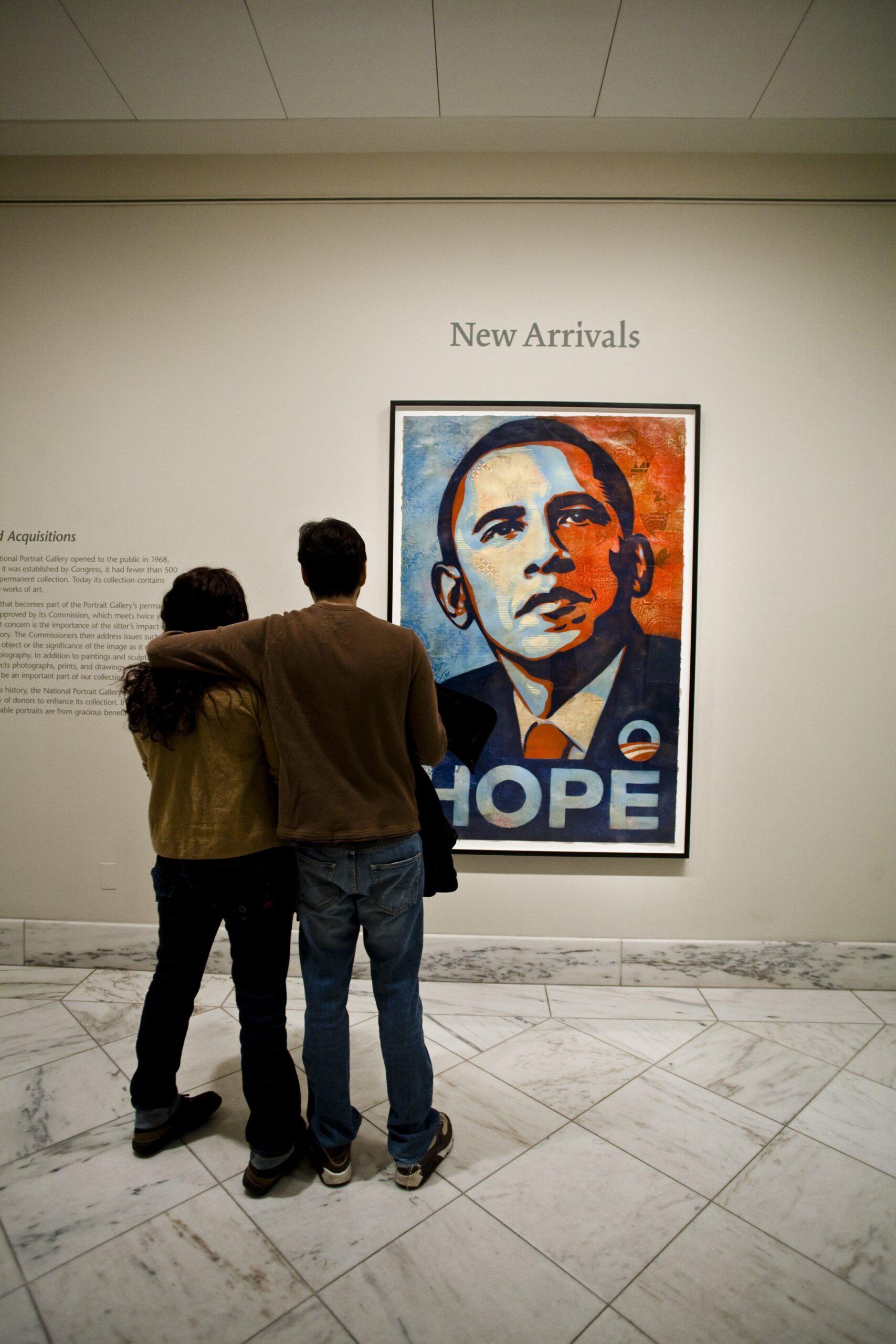 Based on an April 2006 photo that Mannie Garcia took for the Associated Press, the American street artist Shepard Fairey’s image transformed a boring head shot of the youthful Democratic challenger Barack Obama into a colorful splash of campaign propaganda. Fairey rendered Obama’s portrait red, white, and blue, and he applied the “PROGRESS” legend (and later, the more famous “HOPE”) as an urgent response to the disastrous and demoralizing Bush years. As a meme, the image proliferated through all digital and physical pores of American political life. Sometimes you’d see it as a light-pole sticker. Other times you’d see it as a friend’s Facebook profile photo. I worked in Iowa, New Hampshire, and Washington, D.C., as a young Obama intern; naturally, I saw the image everywhere. In fact, the image spread globally, morphing to suit countless subjects of celebration and satire. The Obama “HOPE” poster was hip and inspirational. Now, it’s iconic — the crown jewel in a treasure trove of Obama pop iconography. The “HOPE” poster represents not only a euphoric spike in American optimism; it also encapsulates the very nature of Obama’s political career: a rush of pop fluency and empathy, deployed toward ends more complicated and distressing than the slogan lets on.