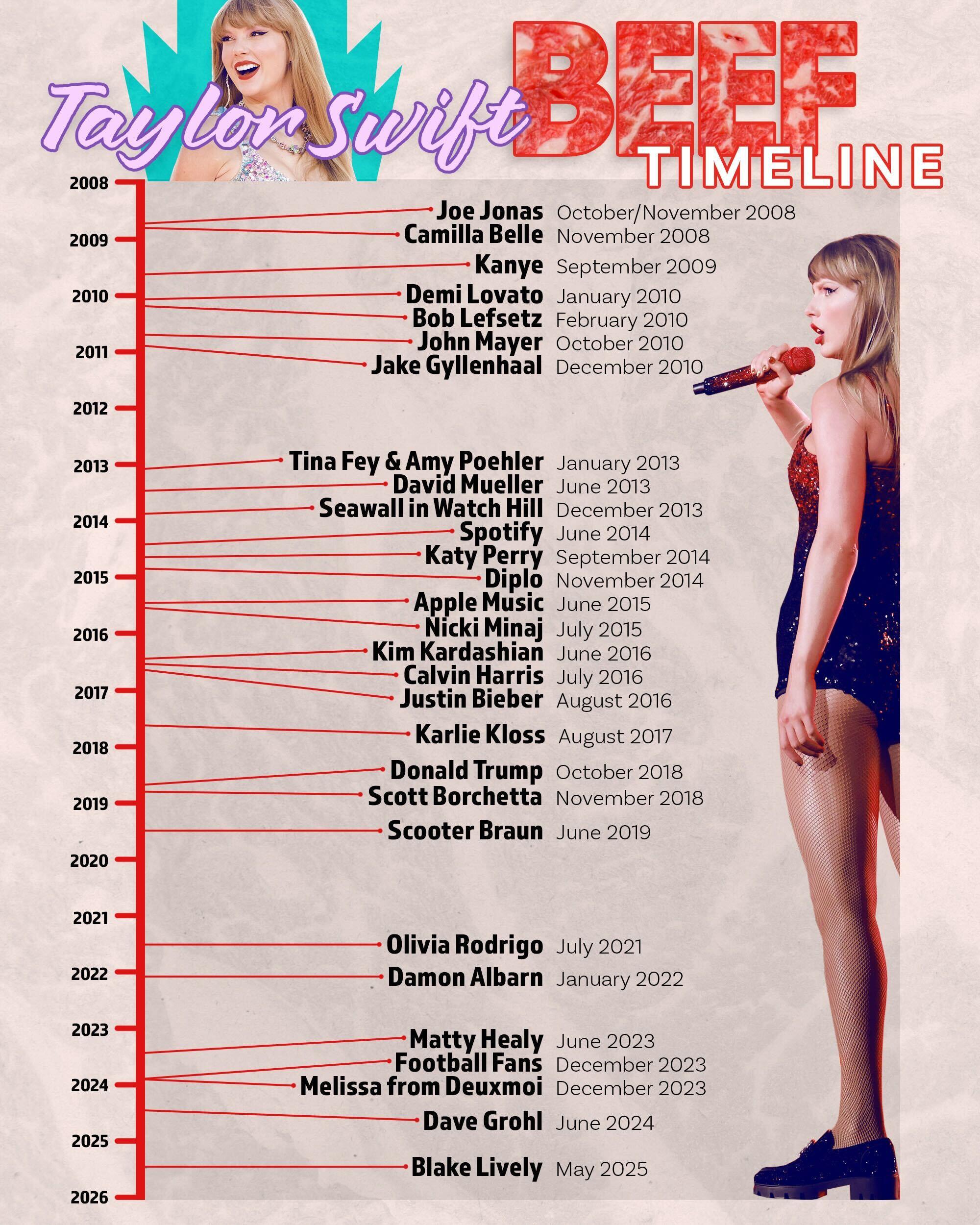 It can start big or small. Over the years, Swift has beefed with niche music critics, surfers and Rhode Island homeowners, Kim Kardashian, Kanye West, and some of the biggest tech companies and streaming platforms in the world. By my count, she’s had 29 public beefs, the first being with ex-boyfriend Joe Jonas in 2008, and the most recent being a budding beef with once bestie Blake Lively. There were instances before Jonas in which Swift showed her capacity to clap back, of course, on songs like “Picture to Burn” off her debut album, where her beef at the time was with a guy who wouldn’t let her drive his stupid pickup truck. But after Jonas broke up with Swift via phone call, everyone learned something about her willingness to name names and air dirty laundry in song. The intro to the song “Last Kiss,” off Speak Now, is 27 seconds long—the same exact length as the fateful call.
