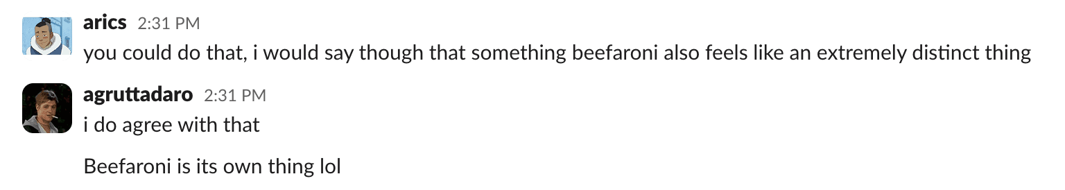 Schuster: In the words of Andrew Gruttadaro, Beefaroni is extremely “its own thing” … meaning you can probably not find a single natural material in it.