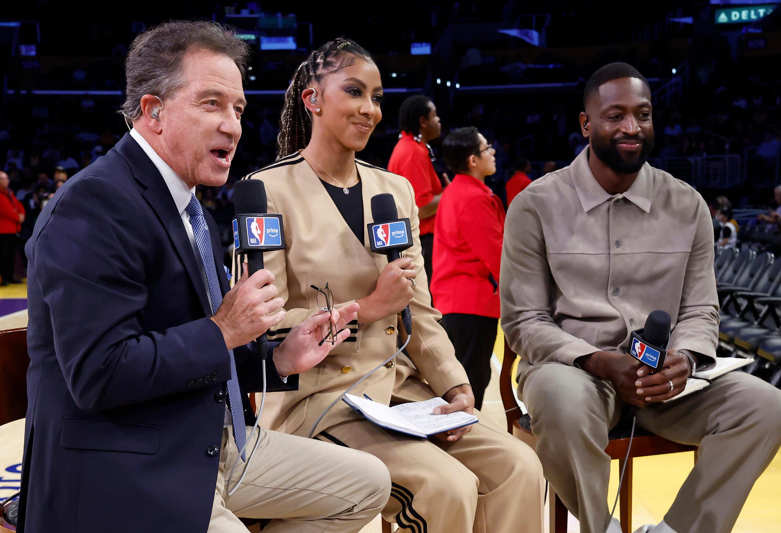 Kevin Harlan, Candace Parker, and Dwayne Wade before the Lakers and Timberwolves game on October 24
