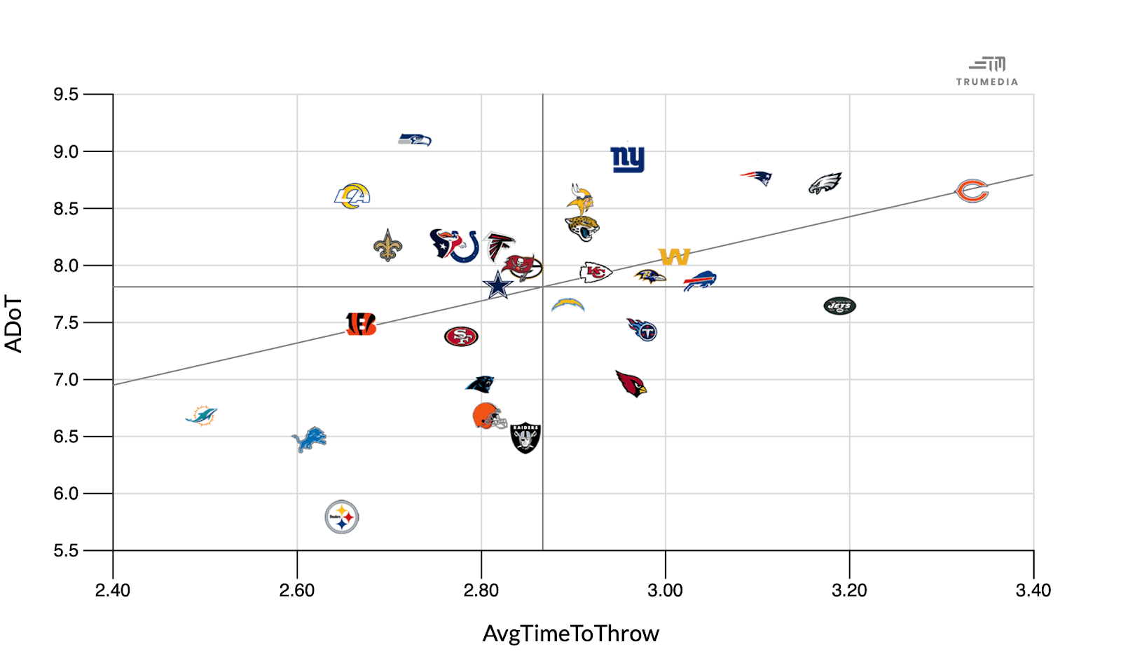 The Lions have not been throwing the ball downfield much at all this year. Jared Goff is second in the league in average time to throw, meaning he dispenses the ball quickly, and the Lions have the second-lowest average depth of target.