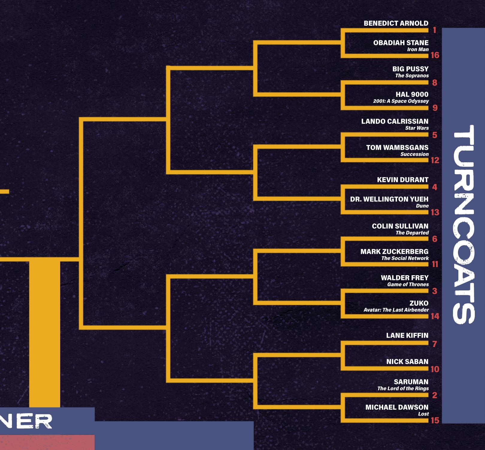 Now we’re asking for your help to determine the greatest traitor of them all. What that means to you surely will vary. Is it the most evil traitor of all time? The cleverest? The most significant? The most—for better or worse—lovable? That’s up to you to decide. All we ask is that you consider, in each matchup, the true essence of traitordom. Let that be your guiding light. We trust you.