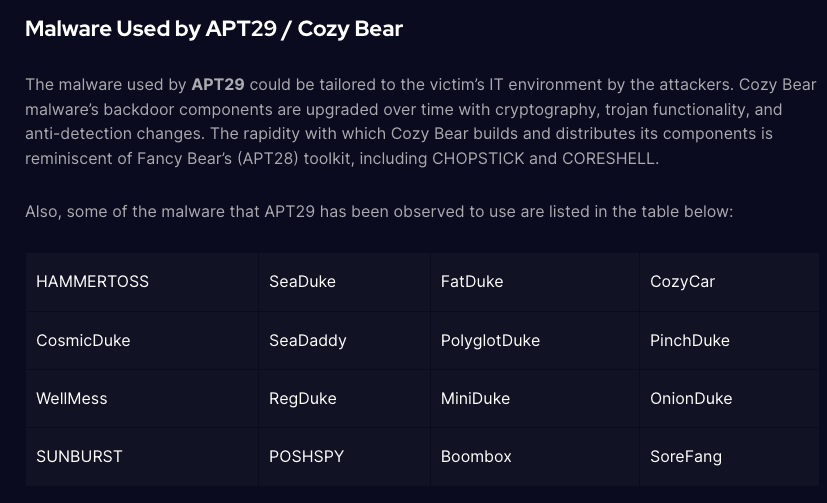 IRL: The SVR and the FSB are semi-competing intelligence and espionage networks in Russia. And Cozy Bear? Ruh-roh, just some state-adjacent hacker/spear phisher hotshots who probably already hacked into your corporation’s (and/or your country’s!) enterprise software suite years ago.