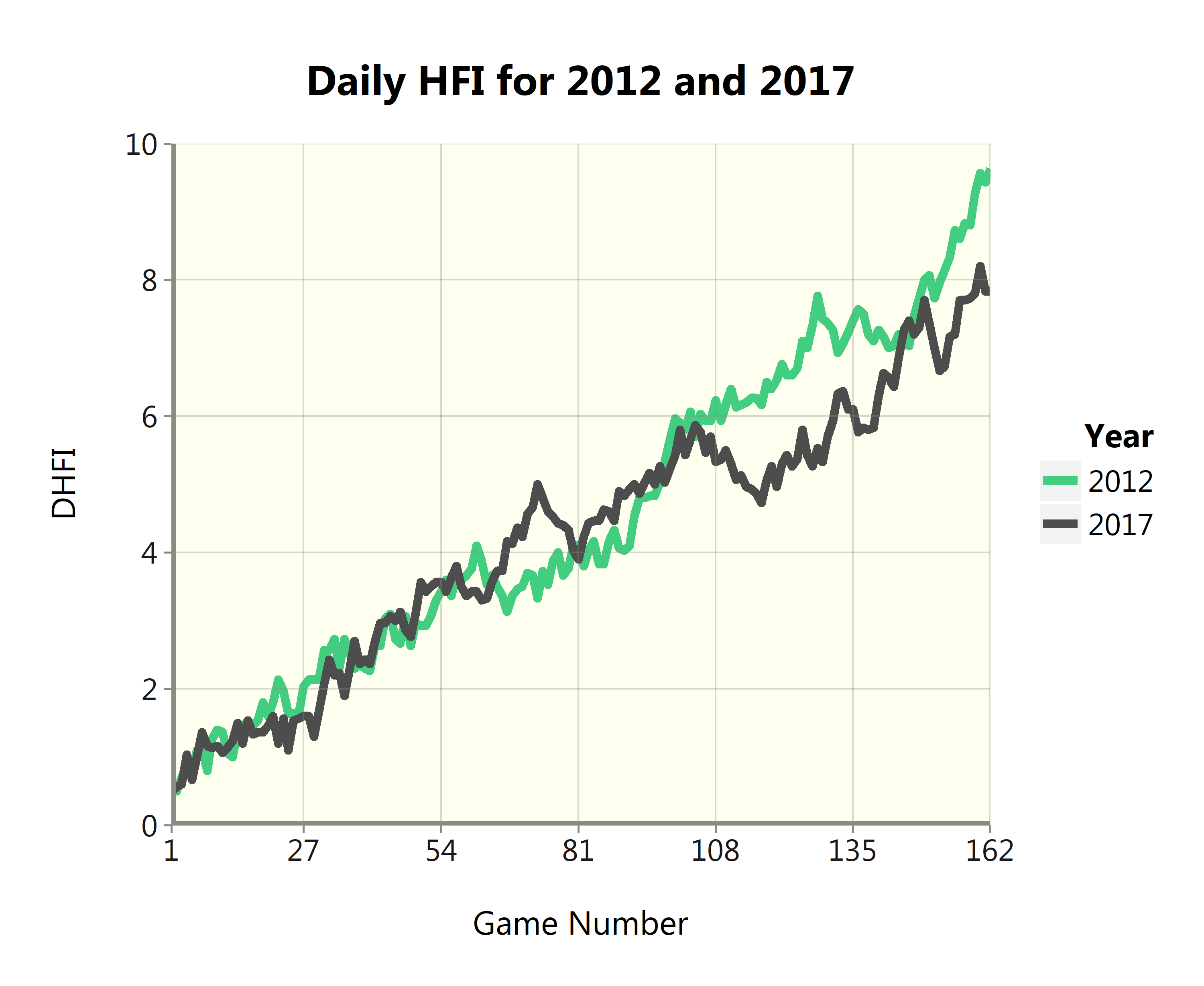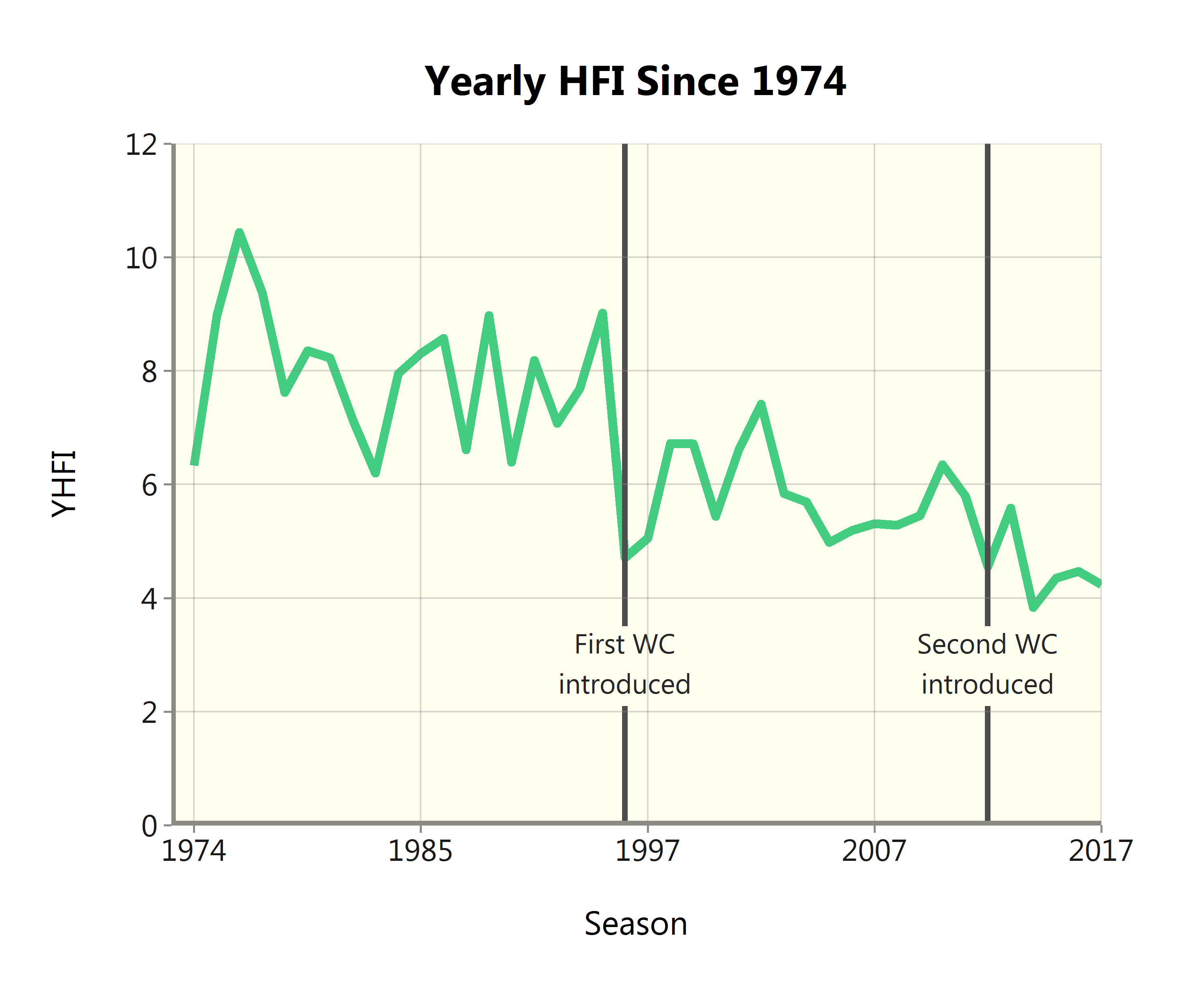 The graph below displays the yearly HFI back to 1974, save for the strike-shortened 1981, 1994, and 1995 seasons.