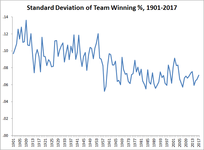 Of course, preseason projections don’t always accurately reflect full-season reality, and some supposed “super-teams” don’t deliver. (Cue the crotchety-commentator type intoning, “That’s why they play the games.”) A graph of the annual standard deviations of actual team winning percentage during MLB’s modern era (1901 on) tells a different story.