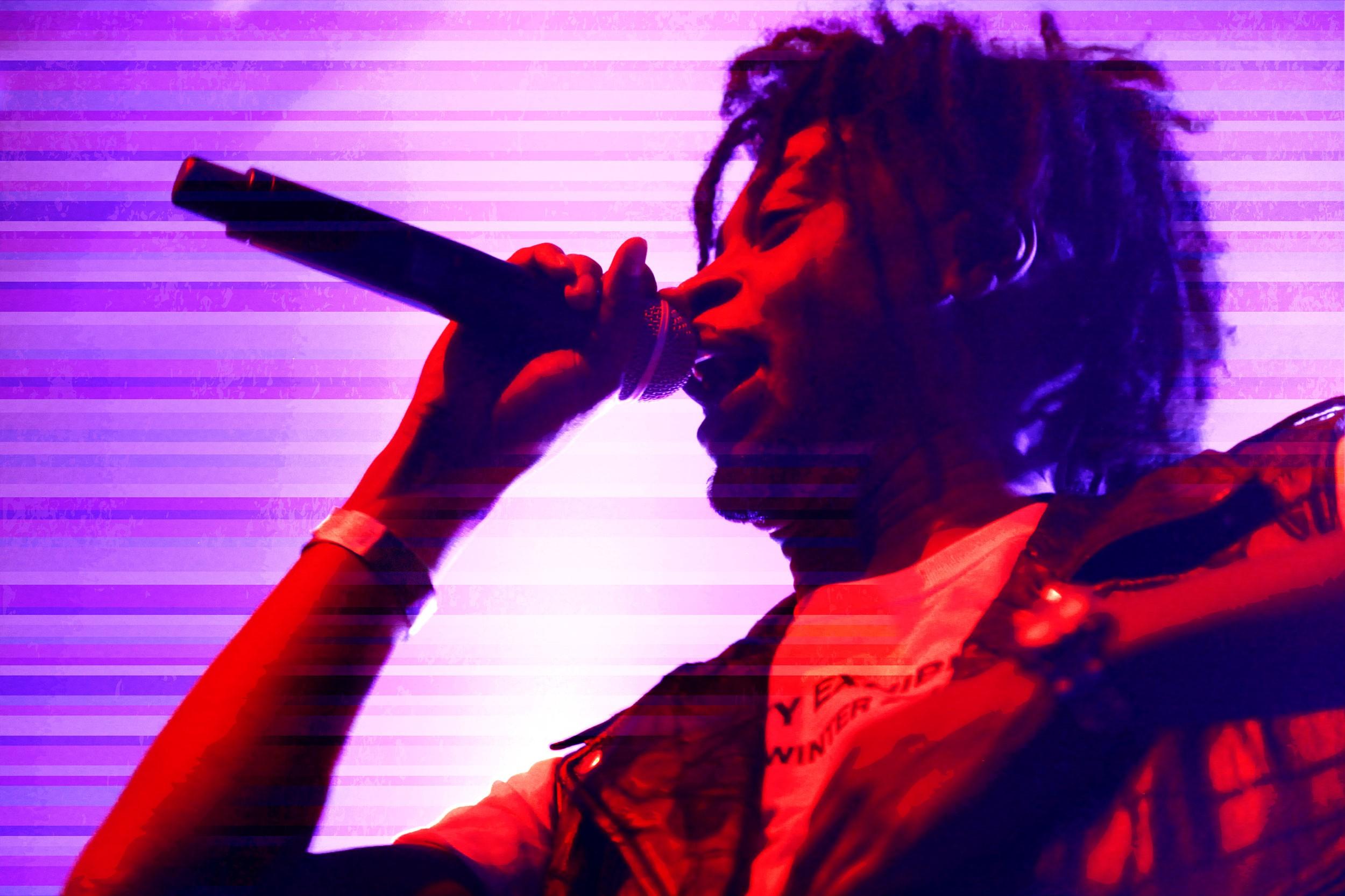 We kick off with a song called “Downward Spiral.” We are firmly in the Ol’ Dirty Bastard–Lil Wayne tier here, amid other chemically addled clown princes constantly flirting with outright tragedy, making transcendent art that comes at an enormous personal cost, shaming us even as it exhilarates us. Brown’s just a little further out there. With his gutter-peacock haircut and lewdly triangular tongue and fiendish, gap-toothed grin, Brown has a punk rocker’s visual zeal and a wandering musical ear: Early Atrocity press listed “Raekwon, early Björk, Joy Division, Talking Heads, and System of a Down’s Toxicity” as prime influences. So you’re braced for an industrial Nine Inch Nails dirge, but what you get sounds like a controlled freakout to a groggy Can jam, prog rock as choking spiritual fog.