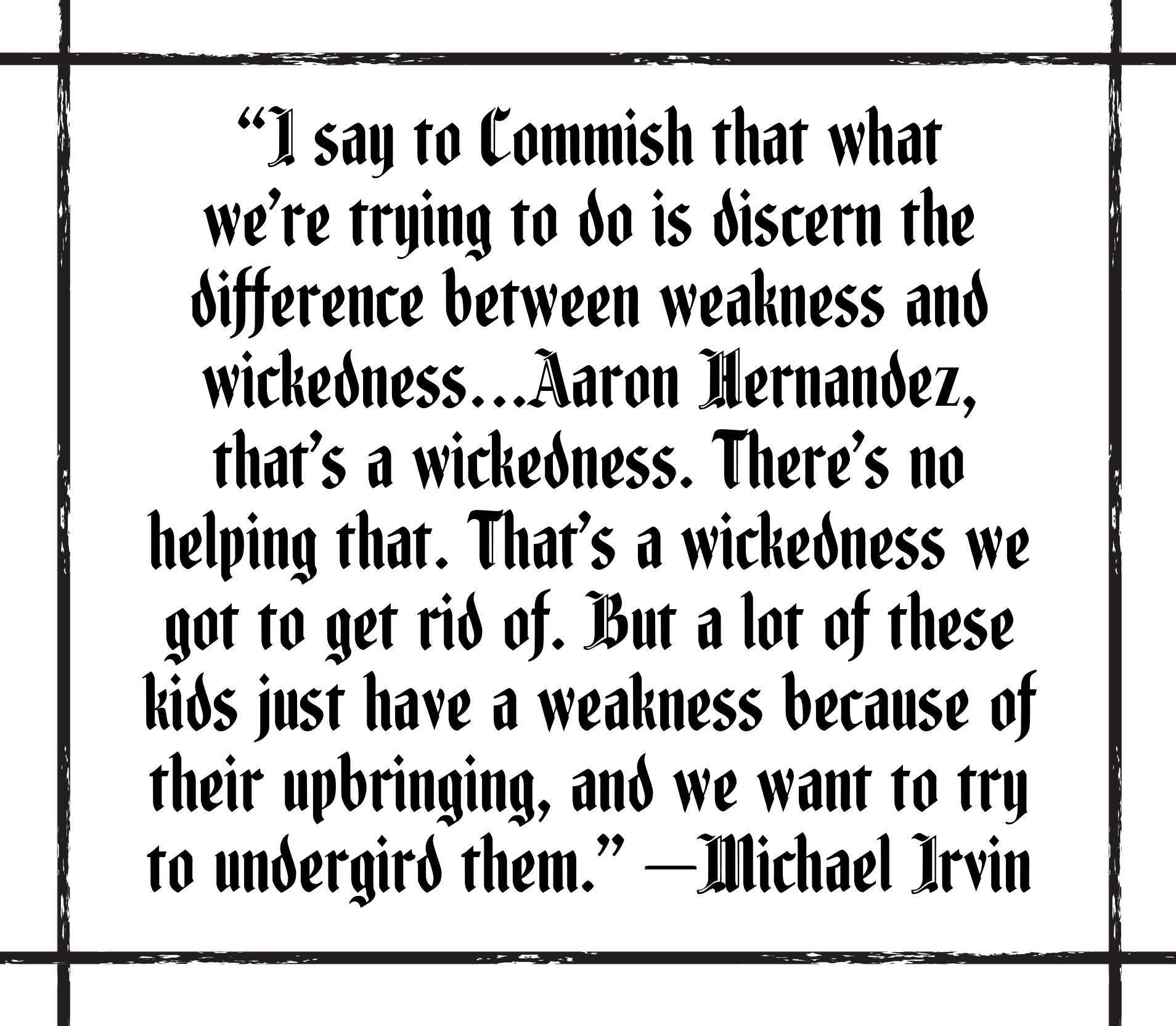 In his occasional chats with Goodell, Irvin urges him to divide law-breaking players into two categories. "I say to Commish that what we’re trying to do is discern the difference between weakness and wickedness …" he said. "Aaron Hernandez, that’s a wickedness. There’s no helping that. That’s a wickedness we got to get rid of. But a lot of these kids just have a weakness because of their upbringing, and we want to try to undergird them."