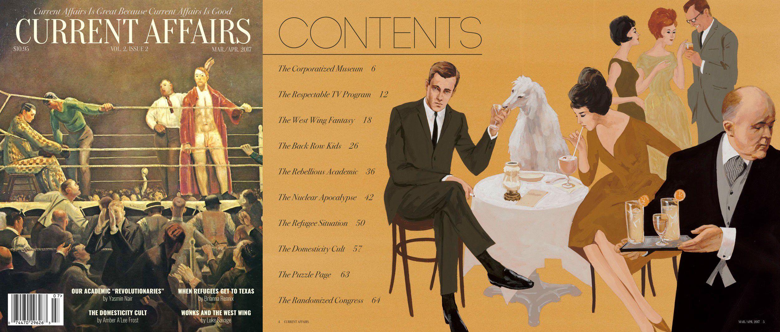 As seen in its initial issues, the Current Affairs approach is about cloaking leftist politics in playful imagery and sharp writing, rather than charts and graphs. Robinson still designs it himself. "I want every page to look different from the other page," he says. "There’s almost no consistency." The accessible presentation and voice "invites people who don’t necessarily agree with the underlying point to read this," he continues. "We have a lot of people who are conservatives read us because we make stuff people like to read."
