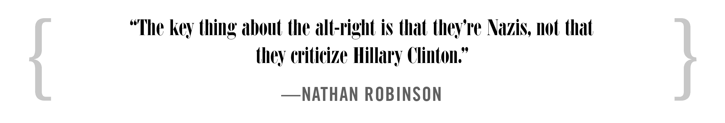 "There is a left that’s critical of the left just like there’s a right that’s critical of the right, but it’s misleading to categorize it that way. The people on the alt-right really are pretty monstrous. Freddie deBoer is not Richard Spencer," Robinson says, referring to a popular leftist blogger and academic. "The key thing about the alt-right is that they’re Nazis, not that they criticize Hillary Clinton."