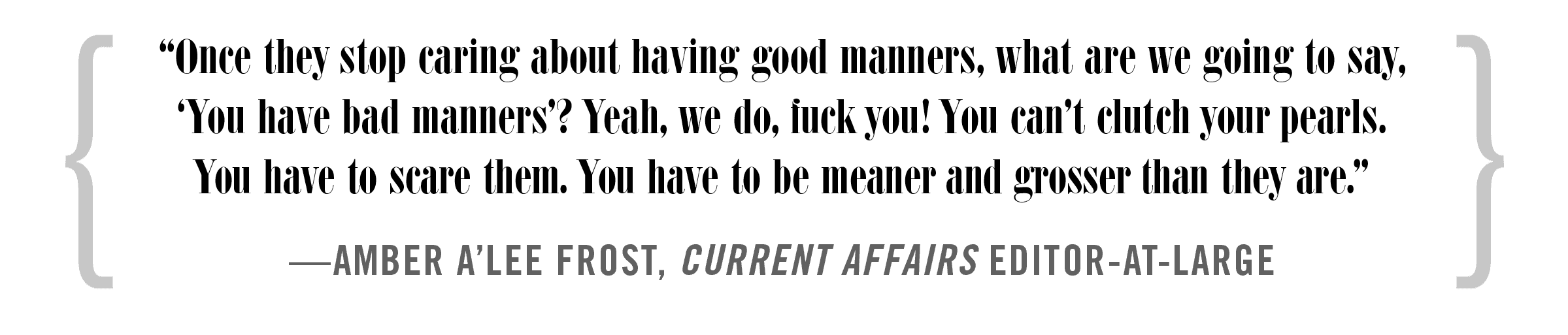 The magazine’s standout pieces take the form of manifestos, like Robinson’s call for a "Luxury Leftism," a vision of socialism based not on austerity or self-sacrifice but limousines, mansions, and parties for all as equals. He asks, why shouldn’t your politics enable a good time? Amber Frost contributed a key piece called "The Necessity of Political Vulgarity," arguing against Voxian wonky aloofness: "Vulgarity has always been employed in revolutionary rhetoric," she writes. Being mean "is a crucial rhetorical weapon of the politically excluded."
