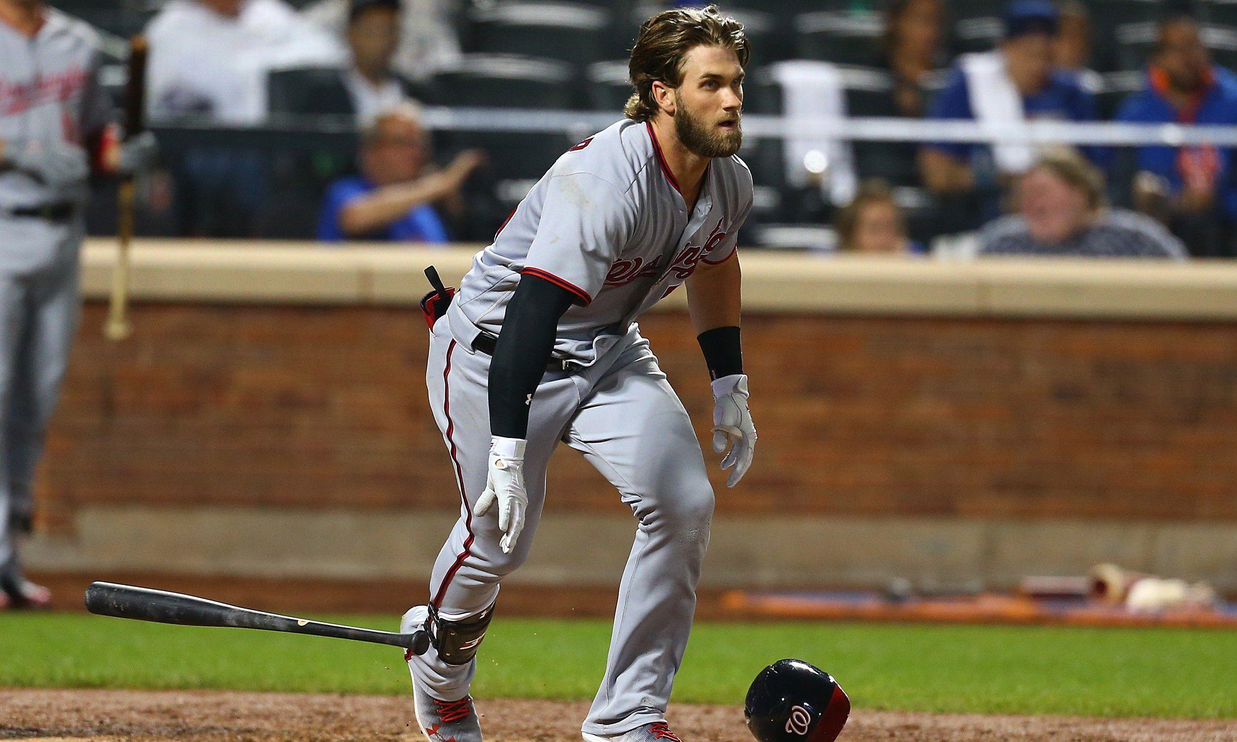 Legend has it that Willie Mays never wore a hat that fit him properly so that when he was running down fly balls, his cap would fly off and it’d look cooler. Harper appears to be a devotee of that school of thought, because here we see him, sans helmet, before he’s even left the batter’s box.