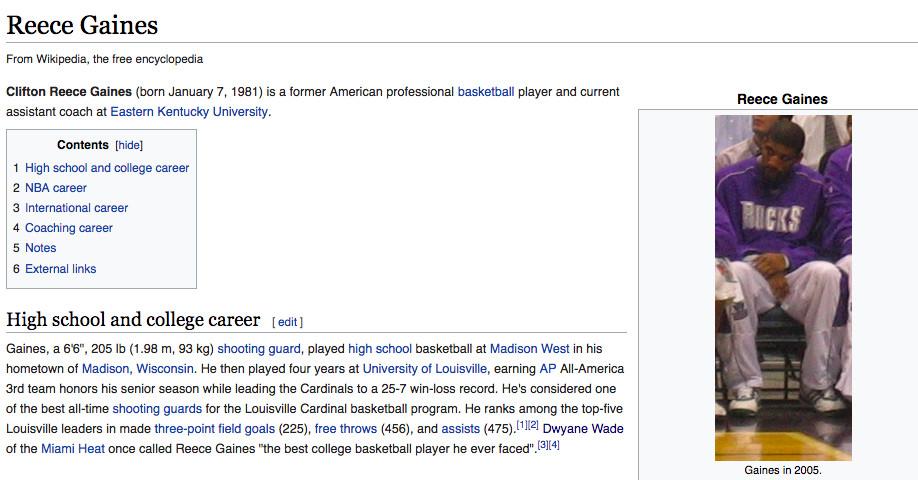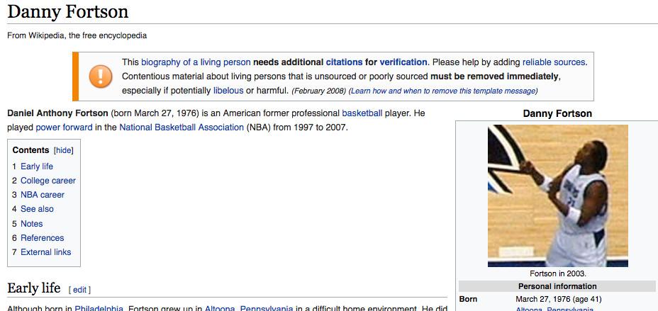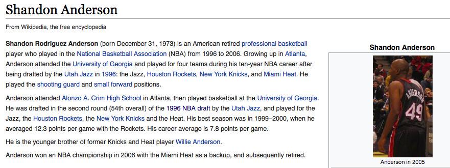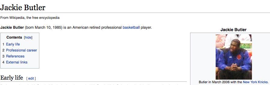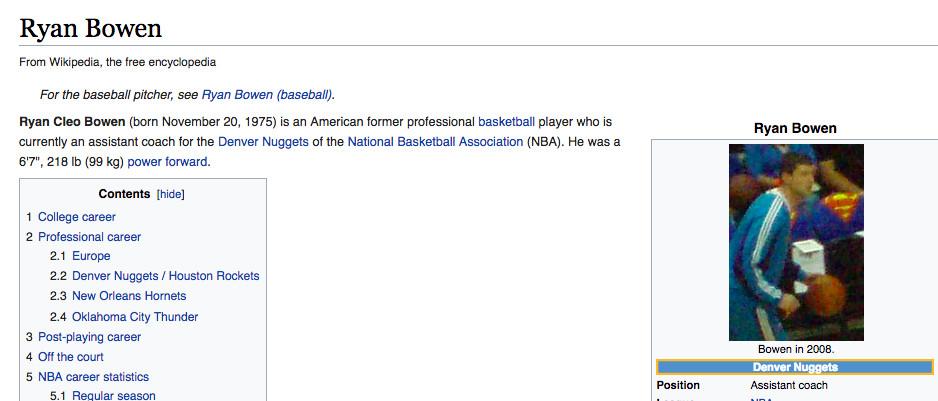 Some NBA Wikipedia photos are as distant, grainy, and ugly as something I could take on my iPhone. Some come from the instances when fans run into players off the court and snap shots then. (Here is Darius Miles, and here is the uncropped photo of Darius Miles with a guy giving two thumbs up that will represent Miles for the foreseeable future.) This Wiki photo problem is an issue for a handful of current NBA players — such as Taj Gibson, Wilson Chandler, and Dahntay Jones — but the most doomed players are those who retired a short time ago, after it became feasible for people to bring cameras to games and upload pictures online, but before Wikipedia users recognized the need for high-quality photos on each page.