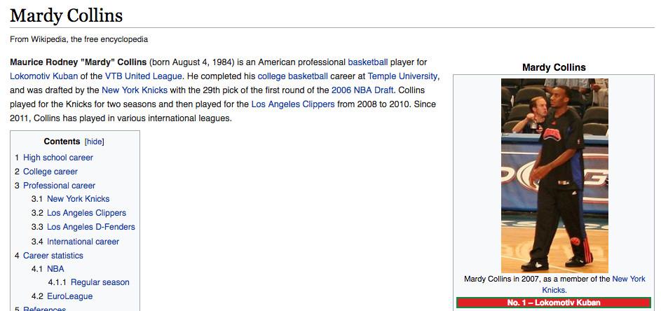 This photo of Mardy Collins is so bad that it isn’t a photo of Mardy Collins. The person pictured looks like Walker Russell Jr., the son of a Knicks scout who got a training camp invite before the 2007–08 season. Russell doesn’t look much like Collins, but nobody has felt compelled to change the picture since it was uploaded to Collins’s page in June 2013. I think the faraway, indistinct nature of the photo is why. I’m in the intensely small subset of NBA fans who could recognize Collins, and even I looked at the image for a while before thinking, "Hey, wait a second!"