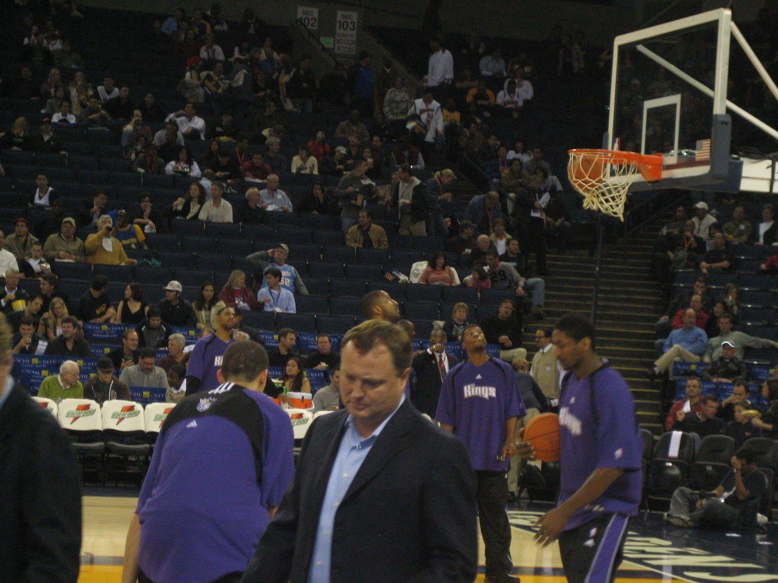 Can you see Shareef? Surely you see Ron Artest — before he was known as Metta World Peace. There’s Ronnie Price near the basket, and Jason Hart taking a jumper. Still can’t find our guy? Look at the man in the unbuttoned jacket who dominates the frame. Now look directly above his head.