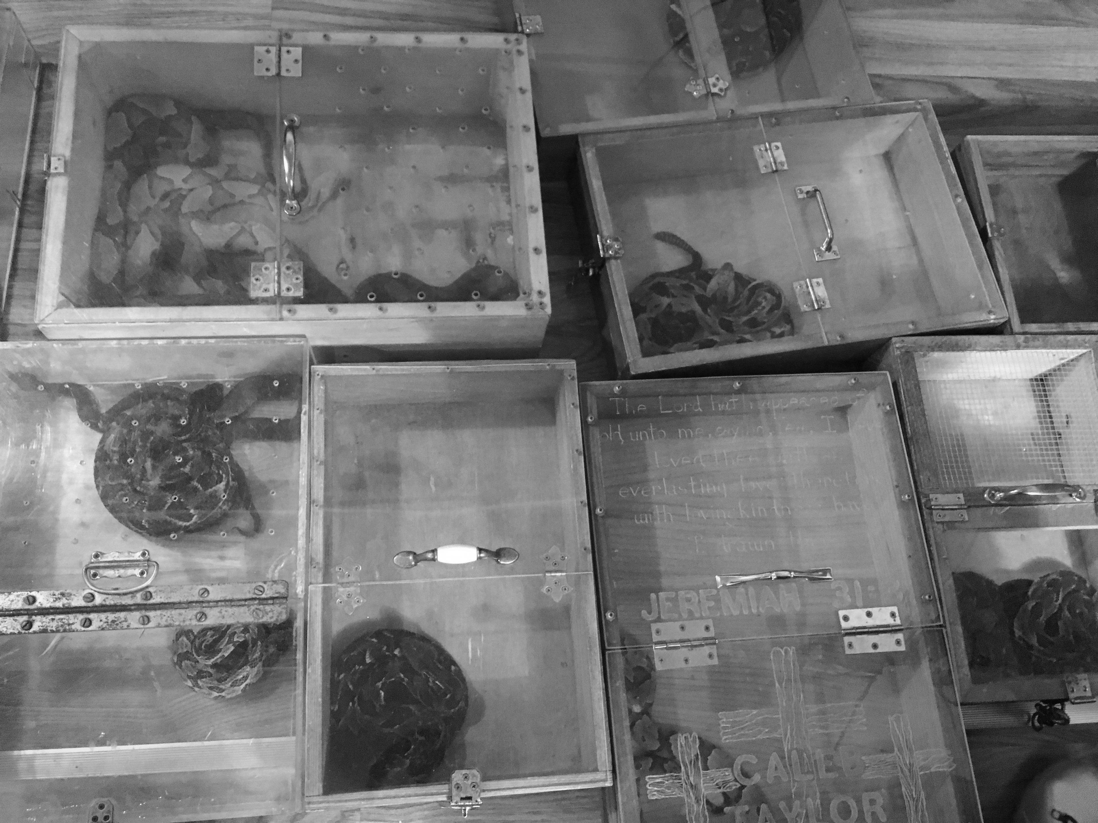 And when the time comes, when they sense that the Spirit has led them to do so, a few kneel down toward the collection of boxes congregants brought with them for the service. They unlock the hinges and reach inside, and when they emerge, they hold poisonous snakes. A cottonmouth. A copperhead. A rattlesnake. They hold them as they worship, lift them to the sky as they dance, crying out to Jesus and touching death while they sing his name.