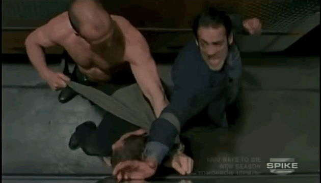 1. Statham is shirtless here because, about two minutes prior, a bad guy ran up behind him and grabbed him by the shirt. Statham slid his way out of it, then used the shirt to tie up two bad guys while fighting them, and after he tied them up, he knocked them both out by punching them at the same time, one with his right hand and one with his left hand. Here’s the double punch: