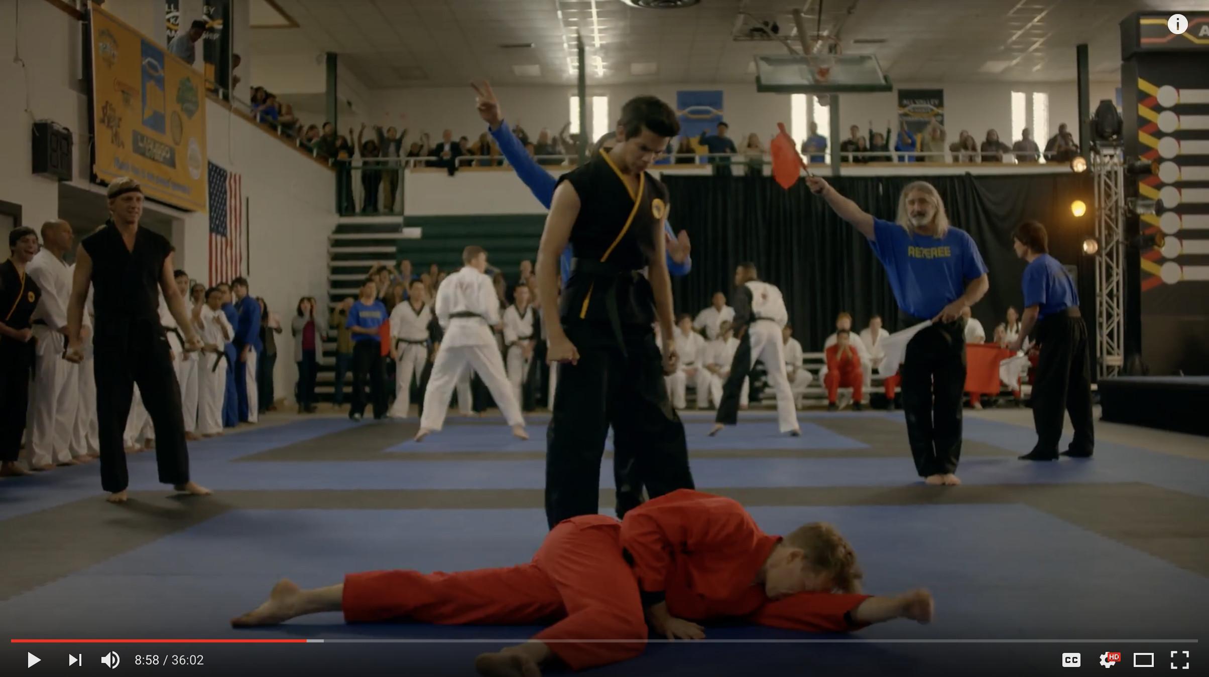 First: The turn that Miguel makes from kind and gentle kid to an all-caps KARATE MENACE in the tournament is so wonderful. There are still flickers of earnest niceness from Miguel (after he wins, for example, he tries to find Samantha in the crowd, hoping that his victory will have proved his worthiness to her), but mostly he has become a tyrant drunk on the nuclear power of his own viciousness.