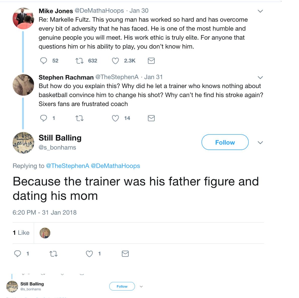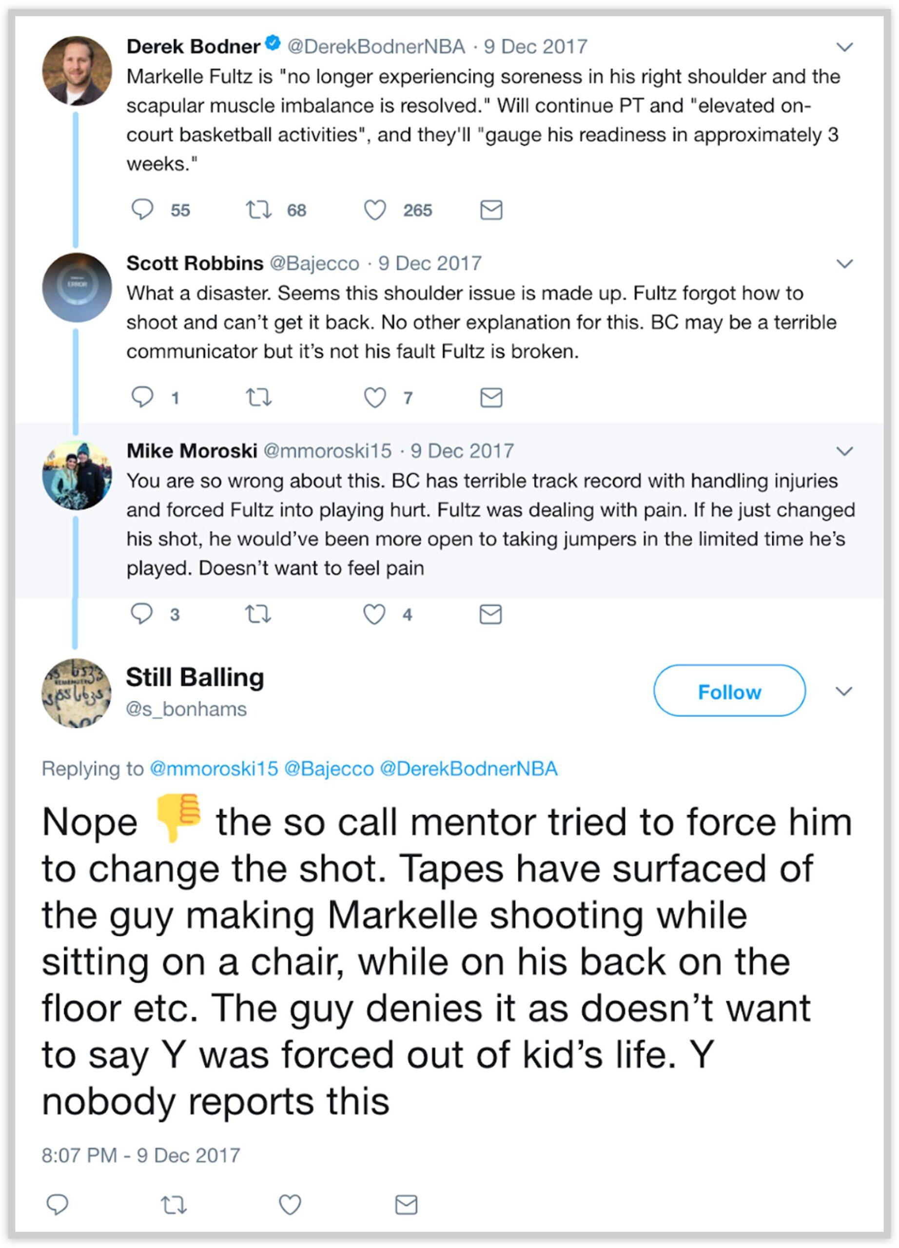 The accounts, though, peddle an alternative story that blames Fultz and Keith Williams, his family friend and longtime trainer. “If somebody would care to go look for the story of what happened with his so called mentor/father figure… it would explain a lot about the shoulder and Fultz ‘ state of mind,” Still Balling wrote in a thread responding to a December post from Bodner. “The so call mentor tried to force him to change the shot. Tapes have surfaced of the guy making Markelle shooting while sitting on a chair, while on his back on the floor etc. The guy denies it as doesn’t want to say Y was forced out of kid’s life. Y nobody reports this.”