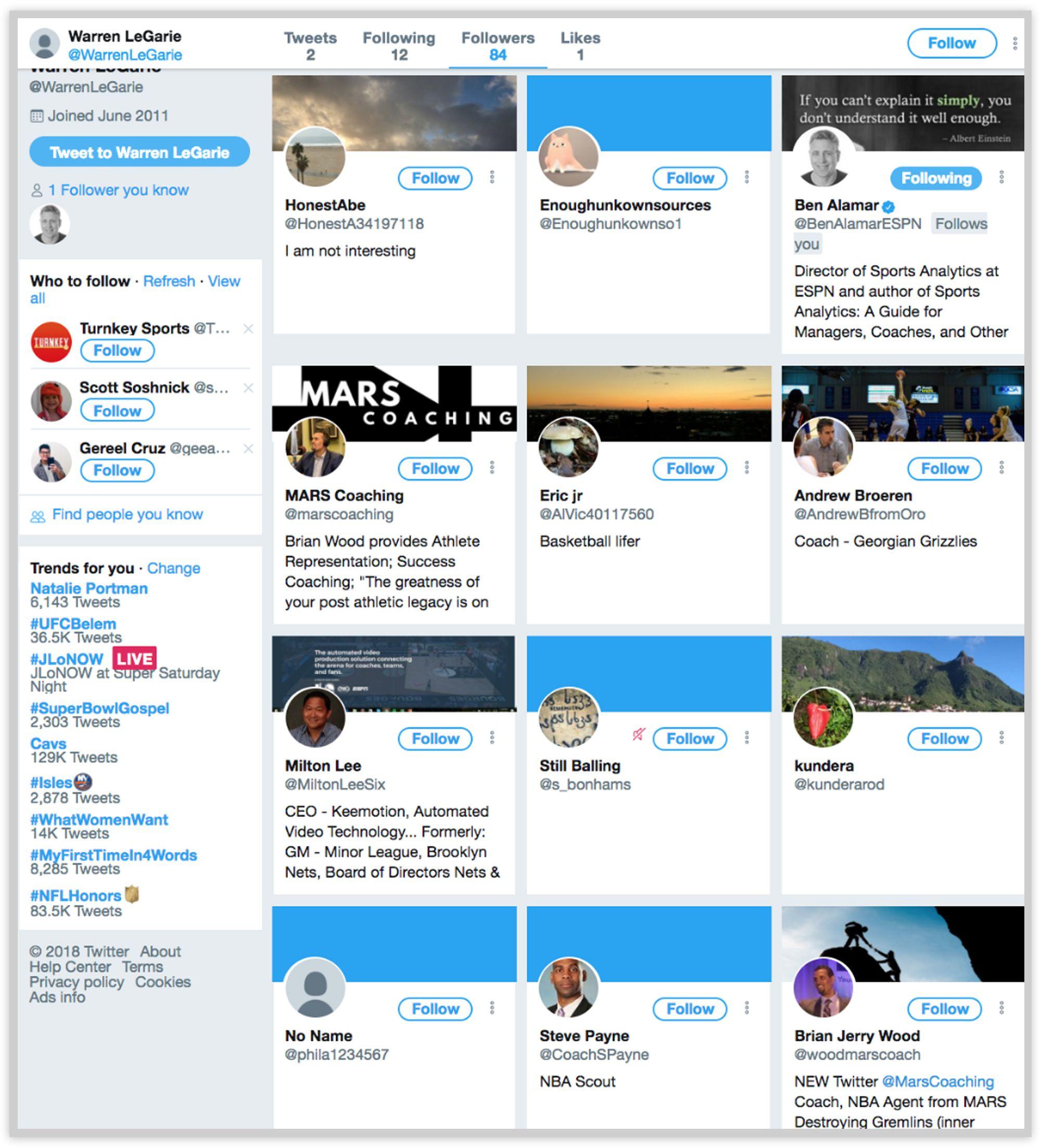 That afternoon, within hours of the call, all three of the accounts I hadn’t discussed with the team switched from public to private, effectively taking them offline—including one (HonestAbe) that hadn’t been active since December. The Still Balling account, which had been tweeting daily, has not posted since the morning of the 22nd (I had already been following Still Balling with an anonymous account of my own, which allowed me to see activity after it went private). Since I contacted the Sixers, Still Balling has unfollowed 37 accounts with ties to Colangelo, including several of his son’s college basketball teammates, a former coach from his son’s high school, and an account that shares the same name as the agent Warren LeGarie, who has represented Colangelo in the past.