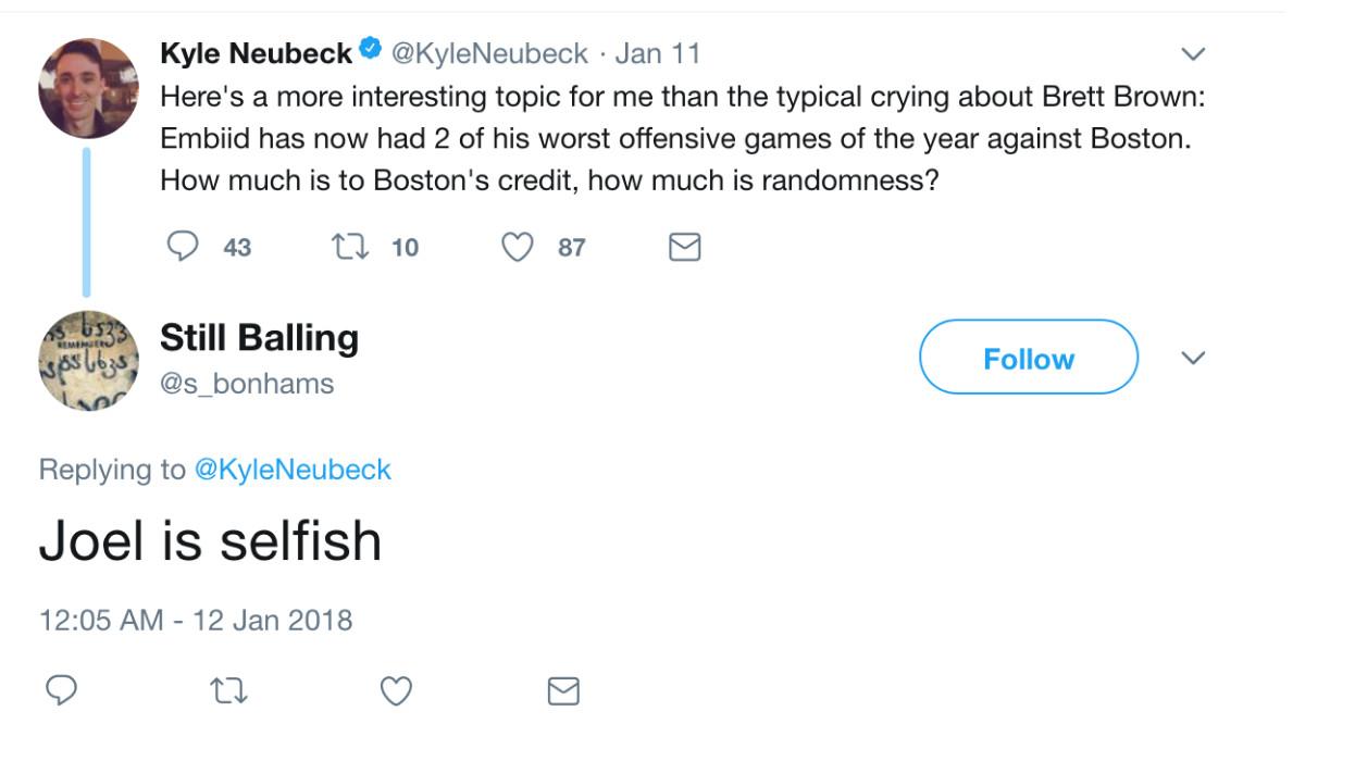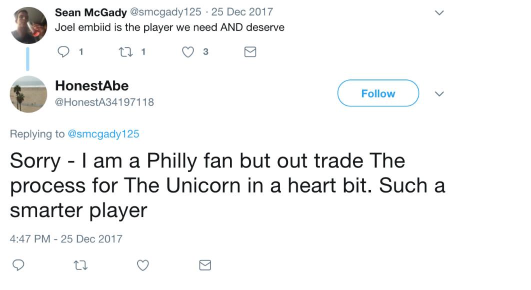 In recent months—particularly since Simmons’s emergence as a formidable talent—the accounts became increasingly hostile toward Embiid. Earlier this season, HonestAbe compared him unfavorably to the Knicks’ Kristaps Porzingis. “I am a Philly fan but out trade The process for The Unicorn in a heart bit,” the account wrote. “Such a smarter player.” And, in response to a Sixers Nation post about Embiid committing a foul, Enoughunkownsources replied: “I am sure it is hard for him ‘to process’ the fact, that this is now Ben’s team. So he is acting up. This ego foul is costing us big!”
