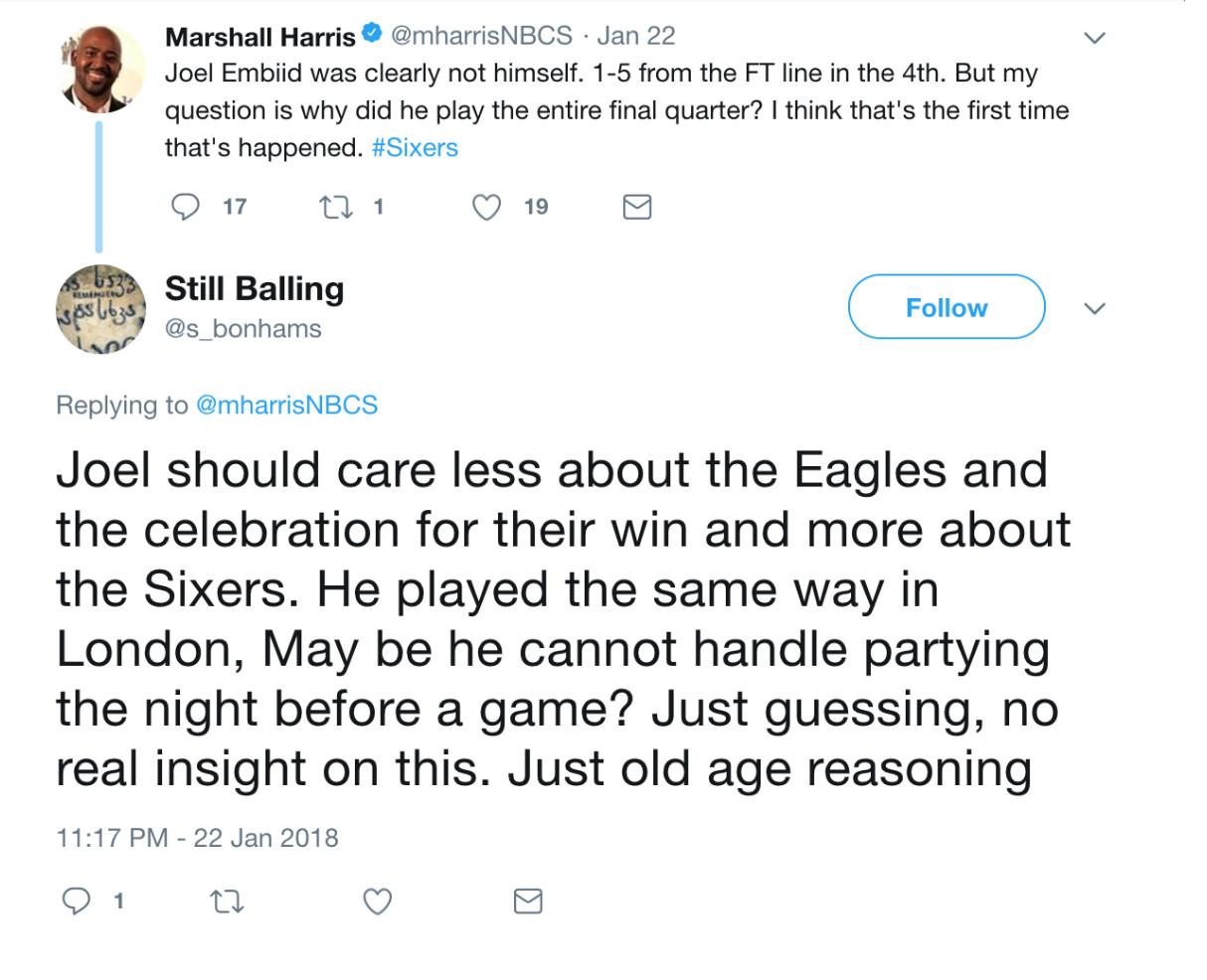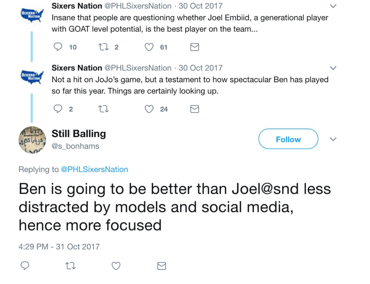 Other times, Embiid was described as “a bit lazy,” “selfish,” and “acting like a tool,” and accused of partying too much. “Ben is going to be better than Joel@snd less distracted by models and social media,” Still Balling wrote in October 2017, in response to Sixers Nation.