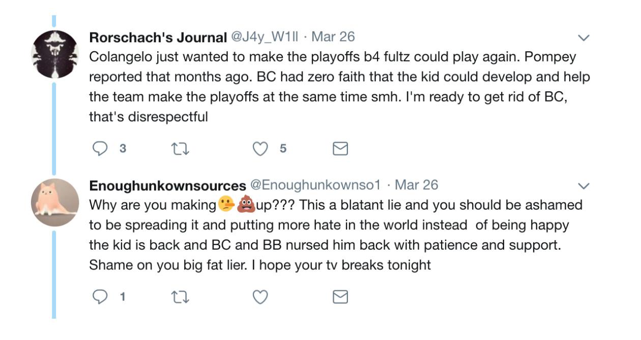 Most disturbingly, the accounts have repeatedly disclosed potentially damaging information about Sixers players, including Okafor, Noel, Embiid, and, most recently, Fultz. The accounts routinely challenge journalists to report these negative claims and, in some cases, have pushed writers to ask players specific questions or to contact the organization to set up interviews. In every example, the accounts have pursued an agenda of absolving Colangelo of blame while vilifying Sixers players.