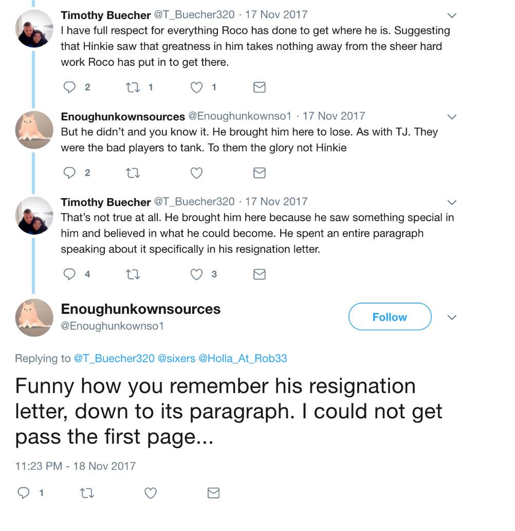 Hinkie, who penned a 13-page resignation letter about team-building theory that included analogies about flightless birds from New Zealand, is a frequent target of vitriol from the accounts. “Funny how you remember his resignation letter, down to its paragraph,” Enoughunkownsources sneered in response to a post praising Hinkie. “I could not get pass the first page…”
