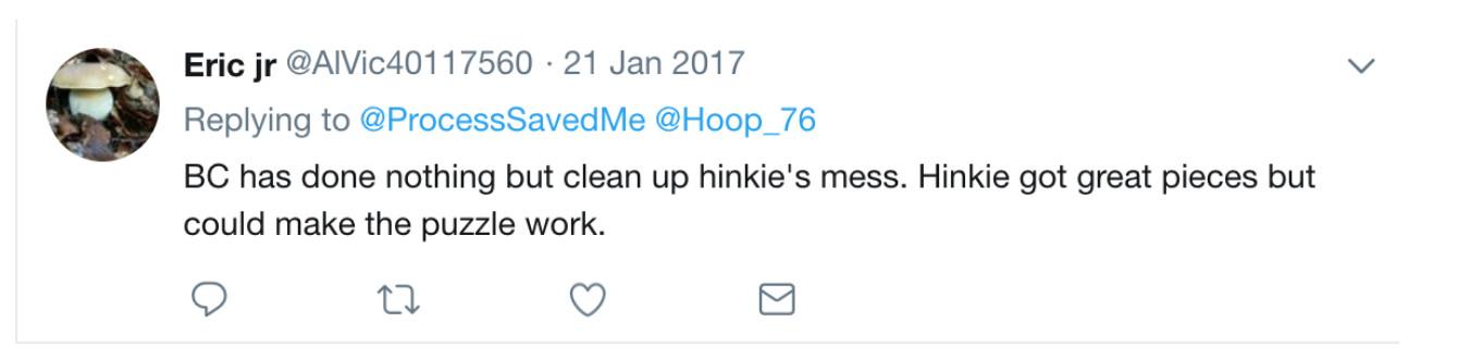 Eric jr bristled at the perception that Hinkie deserved credit for turning around the franchise. “BC has done nothing but clean up hinkie’s mess,” the account wrote in January 2017. “Hinkie got great pieces but could [not] make the puzzle work.”