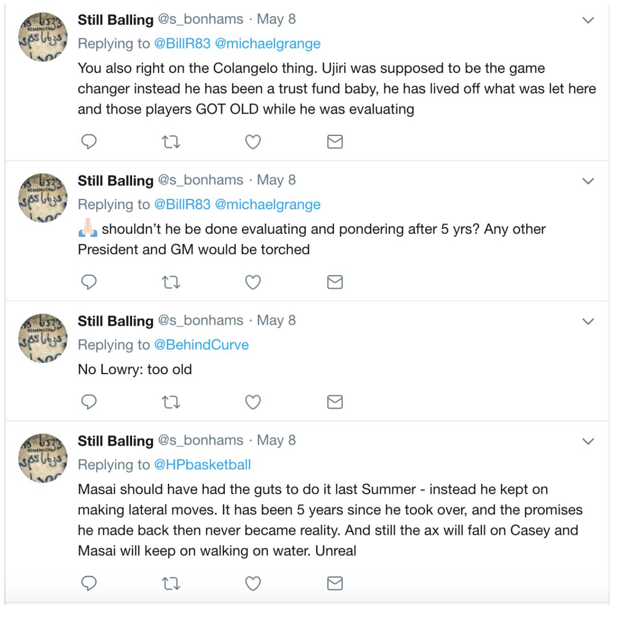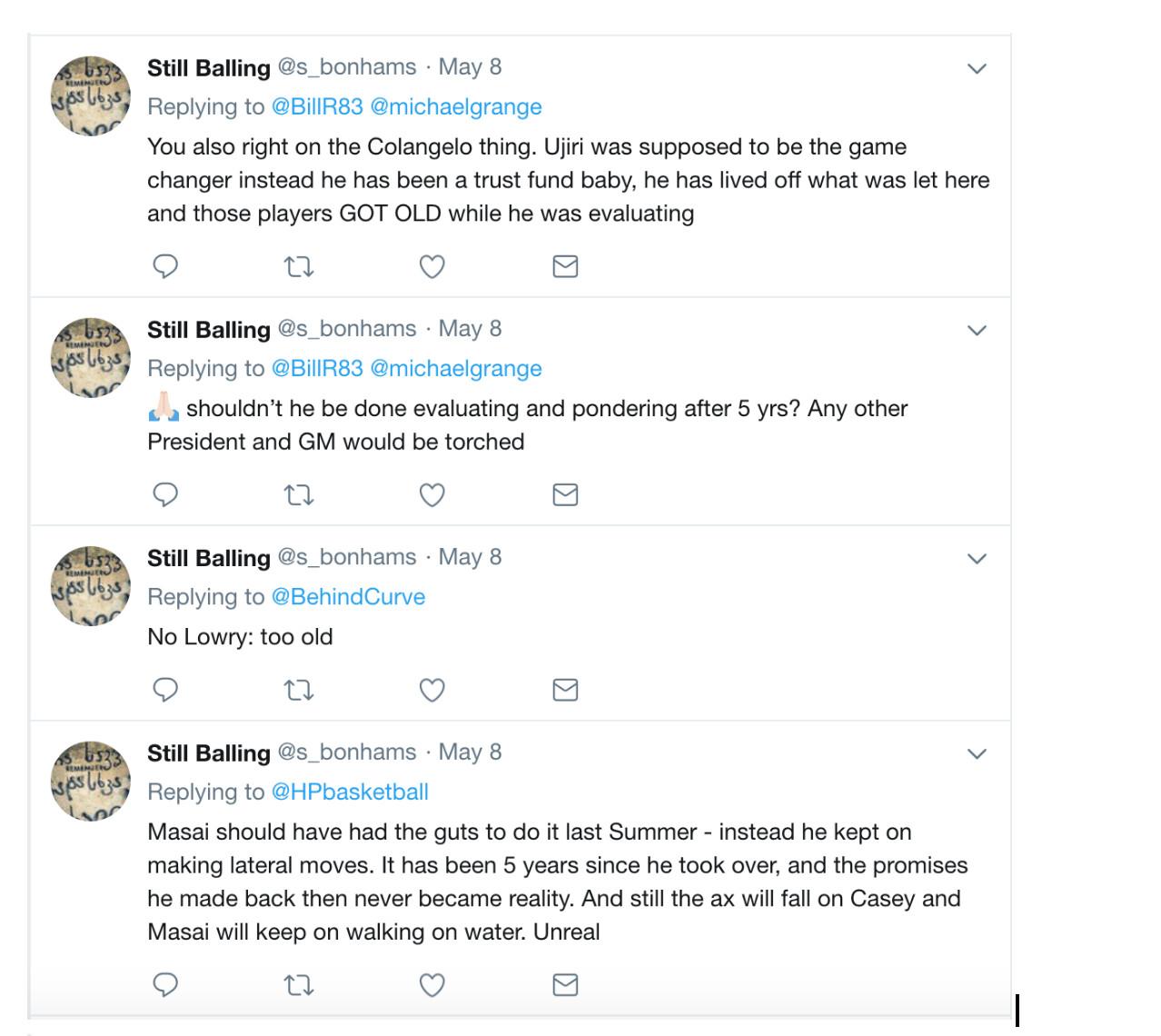 He chafed at the lucrative long-term extension Ujiri signed in the fall of 2016. “You were resigned for 30+ millions this Summer, so yes! please Masai do something!” the account pleaded, feigning the persona of a Raptors booster.