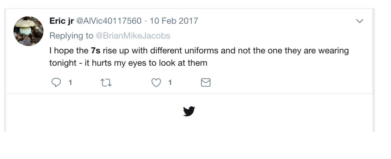 On February 10, 2017, they tweeted, “I hope the 7s rise up with different uniforms and not the one they are wearing tonight - it hurts my eyes to look at them.” That same day, the account for the Delaware 87ers (then the Sixers’ Development League franchise; a year after the circuit became the G League, the team changed its name to the Blue Coats) posted a photo of Colangelo at the game, wearing a headset and sitting with the broadcast team. “.@Sixers President of Basketball Operations Bryan Colangelo joins Tom & Dei on @TCNPhilly live right now!” read the accompanying tweet. According to an advanced Twitter search, this is the only occasion the 87ers account has mentioned Colangelo and the only time any of the five accounts in this investigation referenced the 87ers.