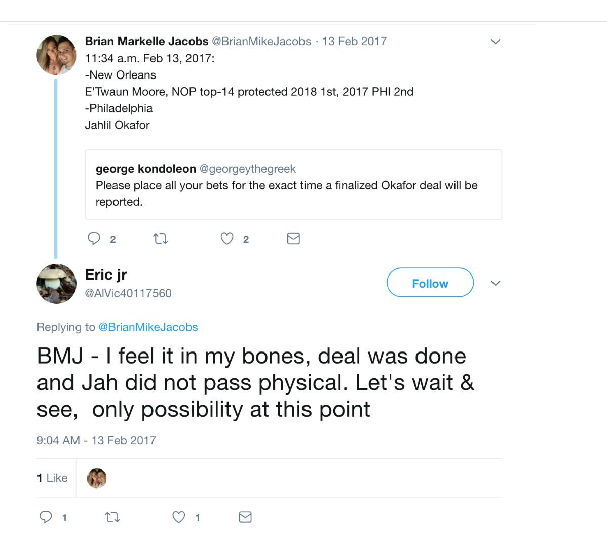 On February 12, while Okafor was home in Philadelphia as the team traveled, a writer for the blog The Sixers Sense named Brian Jacobs posted a highlight from then-Pistons guard Kentavious Caldwell-Pope. Eric jr replied, seemingly off topic, “I must be nuts, I cannot sleep because I worry Jah will not pass physical exams and sent back.” The next day, Jacobs posted a prospective trade that would ship Okafor to the Pelicans for E’Twaun Moore and a pick. Eric jr responded again. “I feel it in my bones, deal was done and Jah did not pass physical,” the account wrote. “Let’s wait & see, only possibility at this point.”