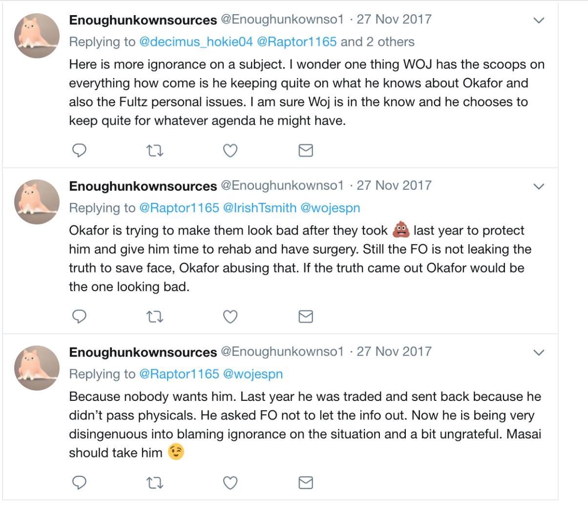 The anti-Okafor campaign resumed early in the 2017-18 season, this time from a different account, when it was reported that Okafor wanted to be traded out of Philadelphia (he was eventually dealt to Brooklyn in December; he would have had to have passed a physical at that time for the deal to have gone through). “Nobody wants him,” Enoughunkownsources posted in a pair of responses to ESPN’s Adrian Wojnarowski. “Last year he was traded and sent back because he didn’t pass physicals. He asked FO not to let the info out...Still the FO is not leaking the truth to save face, Okafor abusing that. If the truth came out Okafor would be the one looking bad.”