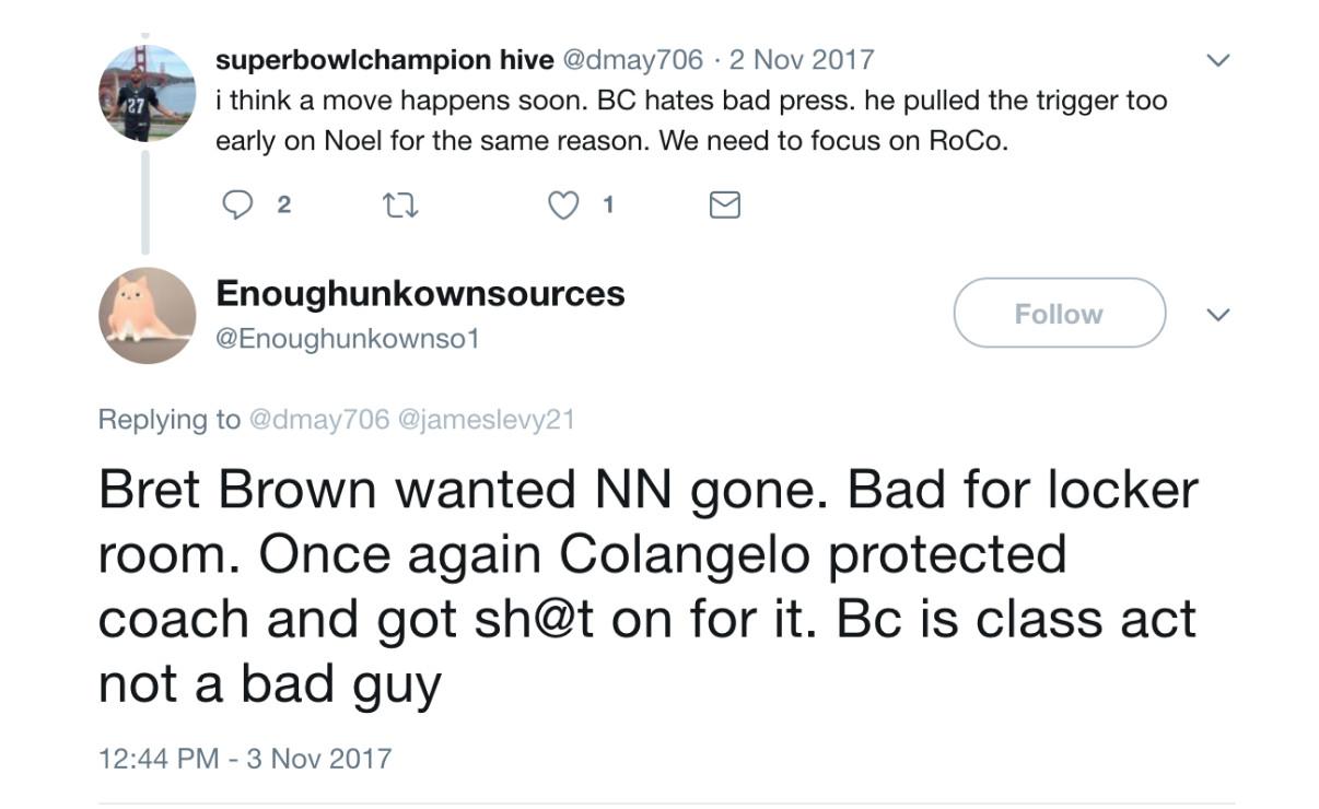 Colangelo also took heat when Noel was sent to Dallas at the 2017 deadline for Justin Anderson, Andrew Bogut, and an announced “first-round pick” that was almost certain to convey as two second-rounders. The accounts didn’t attempt to defend the modest return; instead, they described Noel as a “selfish punk” who was “behaving like a vulture.” Noel was traded, the accounts asserted, because the Sixers’ head coach disliked him. “Bret Brown wanted NN gone,” Enoughunkownsources posted in November 2017. “Bad for locker room. Once again Colangelo protected coach and got sh@t on for it. Bc is class act not a bad guy.”