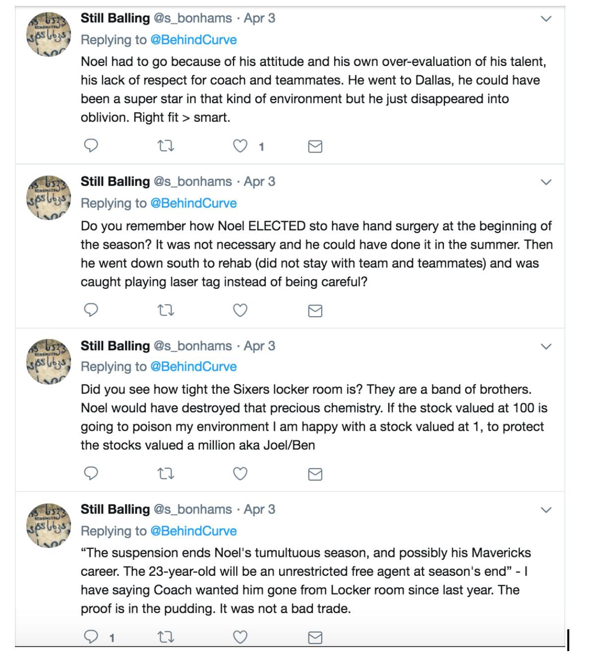 Even this season, with Noel exiled to the bench in Dallas, the accounts continued to bad-mouth the former Sixer. In April, Still Balling wrote, “Do you remember how Noel ELECTED sto have hand surgery at the beginning of the season? … Then he went down south to rehab (did not stay with team and teammates) and was caught playing laser tag instead of being careful?”
