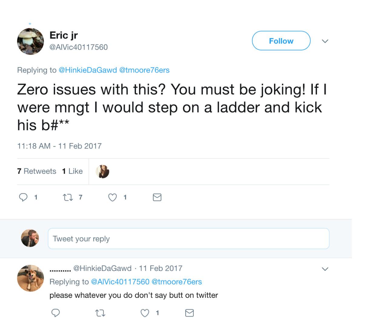 He grew incensed when Embiid took the stage and danced shirtless at a Meek Mill concert while sidelined by that injury. “Too bad that Embiid danced like a fool and the whole disaster happened, next time he will think twice before mocking his team,” Eric jr wrote on February 14, 2017. The account reacted with ire in another post. “If I were mngt I would step on a ladder and kick his b#**,” they wrote. (Nine months later, the Enoughunkownsources account employed similar phrasing: “If I had a medium size ladder I would love to knock some sense in Joel’s head right now,” the account wrote in November. “He is playing like a toddler having tantrums.”) As usual, Eric jr encouraged journalists to write about Embiid’s behavior. “He should be called out on this,” the account tweeted at Derek Bodner, a Sixers writer who now works for The Athletic, “nobody has the guts to do it.”