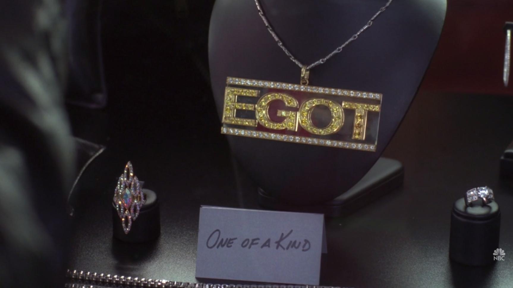 “Who’s an EGOT?” Jordan asks in earnest. “EGOT is not a person, T.J., it’s a goal,” the clerk replies with the wise intonation of a Disney character explaining an ancient spell. “It stands for Emmy, Grammy, Oscar, and Tony.” He explains that the necklace once belonged to Philip Michael Thomas, the Miami Vice actor who—and this part is true—coined the term in a 1984 interview with the Associated Press to describe his professional ambition of winning all four awards within the next five years (though Thomas later tried to backtrack and say he intended the acronym to stand for “Energy, Growth, Opportunity, and Talent,” the die had been cast). “That’s a good goal for a talented crazy person,” Jordan concludes, right before he purchases the necklace and sets out on a multiseason journey to do the same.