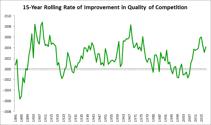 A long list of factors can affect MLB’s quality of competition, including the size of the pool of potential players (which has expanded through the breaking of the color line, the growth of the domestic population, and the internationalization of the sport); competition from rival baseball leagues, other sports, and nonathletic forms of entertainment; skyrocketing salaries and stronger incentives to pursue playing baseball; expansion in the number of teams (which has stayed static for two decades); improvements in player evaluation; and increasingly, improvements in player development. For our purposes, though, it doesn’t matter so much why contemporary players are better; whether it’s mostly talent or mostly nutrition or training, the result is the same. And Lichtman’s data suggests that even 150 years into the existence of professional baseball, the sport’s quality of competition is not only continuing to climb, but is rising at one of the most rapid rates in history.