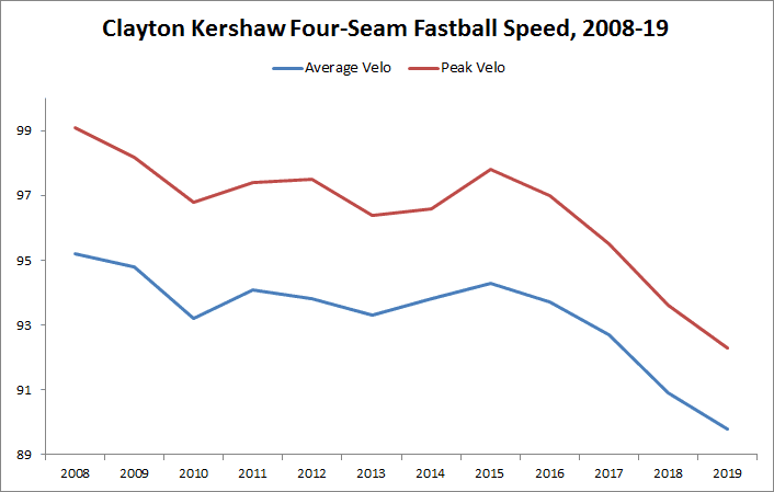 When we last saw Clayton Kershaw prior to 2019, he was being bombarded by the Boston Red Sox, who tattooed him to the tune of a 7.36 ERA and a .907 OPS in his two World Series starts. Tasked with staving off elimination in Los Angeles in Game 5, Kershaw instead allowed dingers to Steve Pearce, Mookie Betts, and J.D. Martinez, unable to stifle Boston’s big bats or extend the Dodgers’ season. More discouraging still, Kershaw’s four-seam fastball speed in that start topped out at 91.5 mph, the second-lowest peak in any outing to that point in his MLB career, besting only a game in May 2018 that was sandwiched between two stints on the injury list.