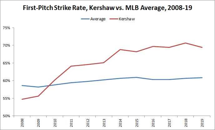 That aggressiveness on the first pitch allows Kershaw to capitalize on the fact that hitters swing only 42.6 percent of the time on first pitches in the strike zone, compared with 80.1 percent of the time on pitches in the zone when pitchers are ahead in the count. Pounding the zone when hitters are less likely to swing allows him to rack up called strikes and maintain a first-pitch strike rate that has held up even as his fastball speeds have cratered.