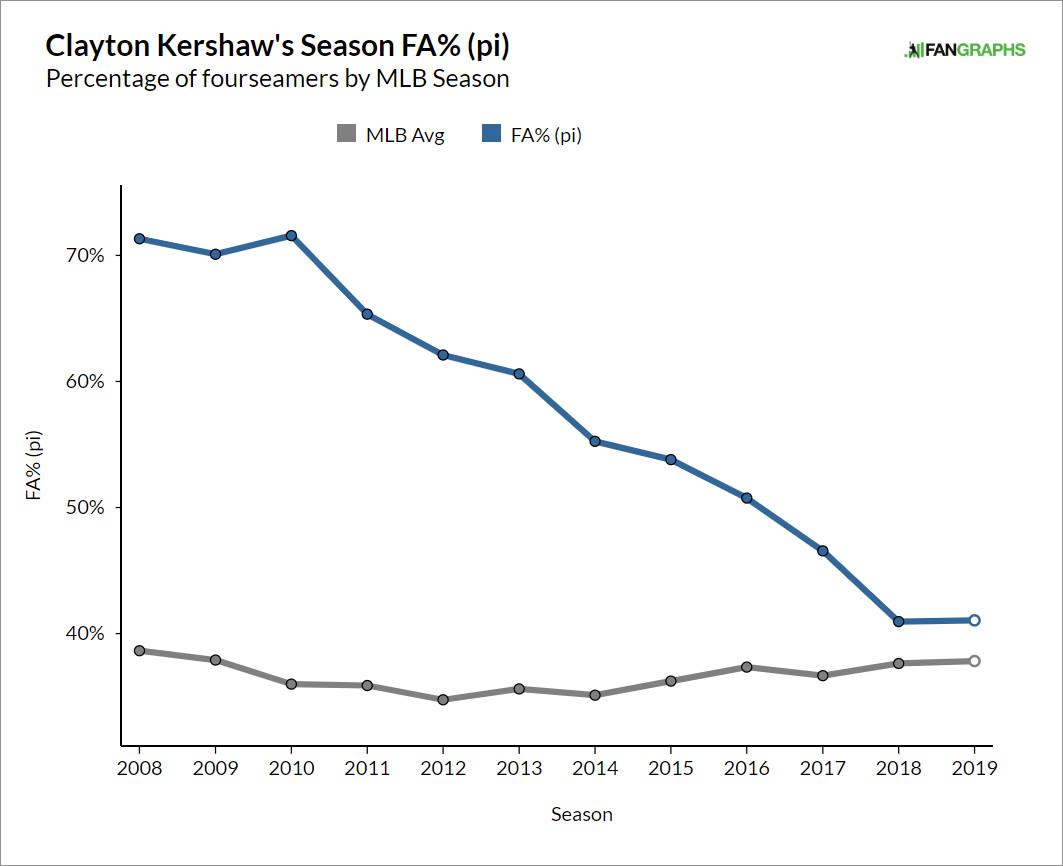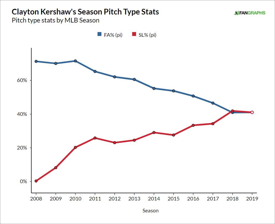 The most obvious way in which Kershaw has adapted to throwing slower fastballs is by throwing fewer fastballs.