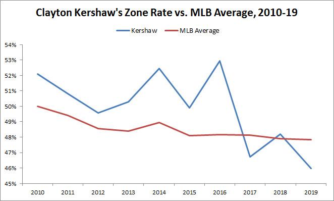In his higher-velo days, Kershaw used to throw a lot of pitches in the strike zone, even middle-middle. He could get away with it then, when he could still blow batters away, but as his fastball speed has sunk below league average, so has the rate at which he throws pitches in the zone. These days, Kershaw tends to lurk on the periphery of the plate.