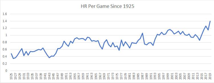 In 1919, Babe Ruth hit 29 home runs, a new single-season MLB record. Before him, only two 20th-century players had even hit 20 home runs in a season: Gavvy Cravath and Frank “Wildfire” Schulte. In 2019 alone, 93 players have already hit 20 home runs or more, with a month left to go in the season. This is a profound statement on how much baseball has changed in the past 100 years, nearly as much so as the modern game’s regrettable paucity of players named “Babe,” “Gavvy,” and “Wildfire.”