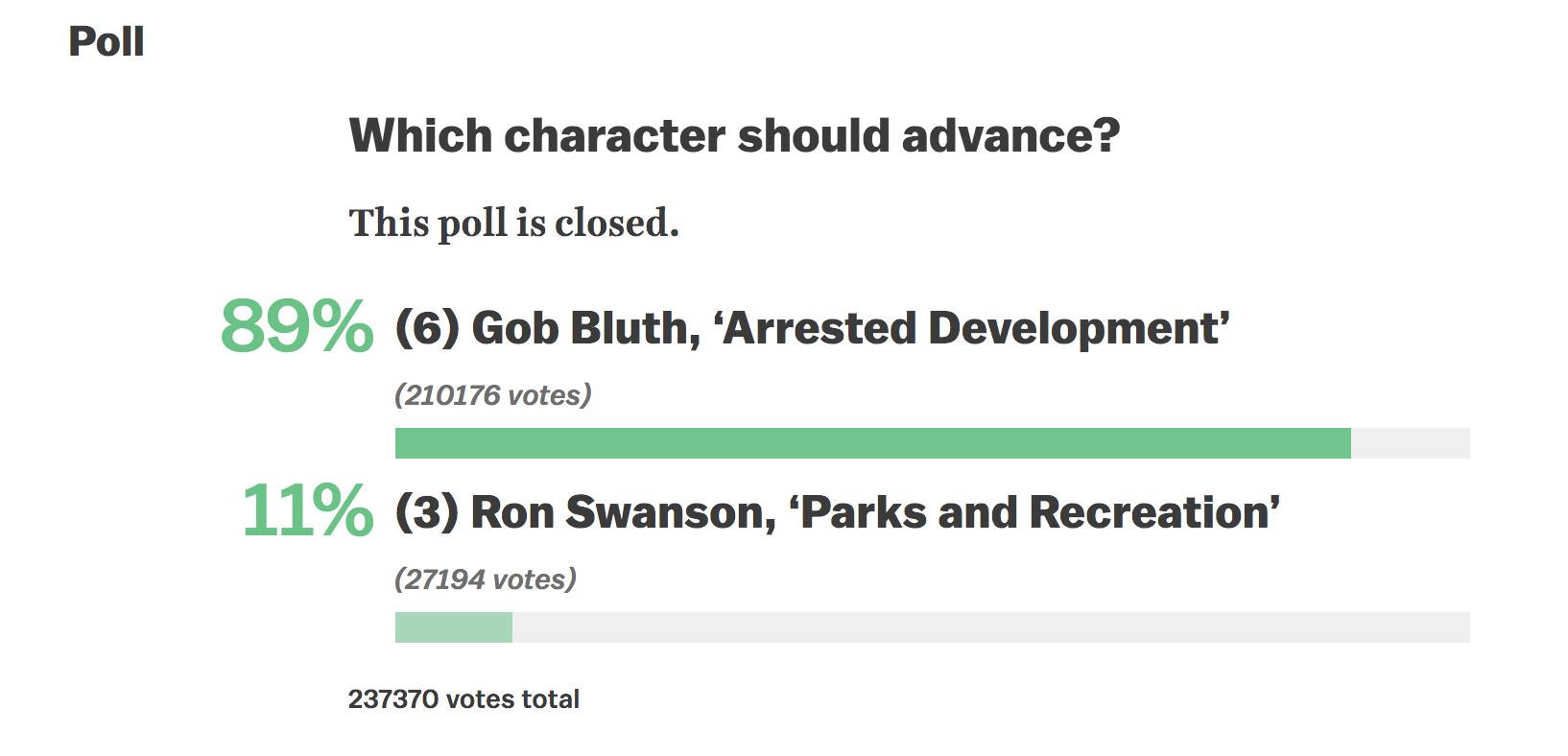 If you visited our Best TV Character bracket on Tuesday, you may have seen a shocking result, which was Gob Bluth, a no. 6 seed, absolutely destroying Ron Swanson, a no. 3 seed: