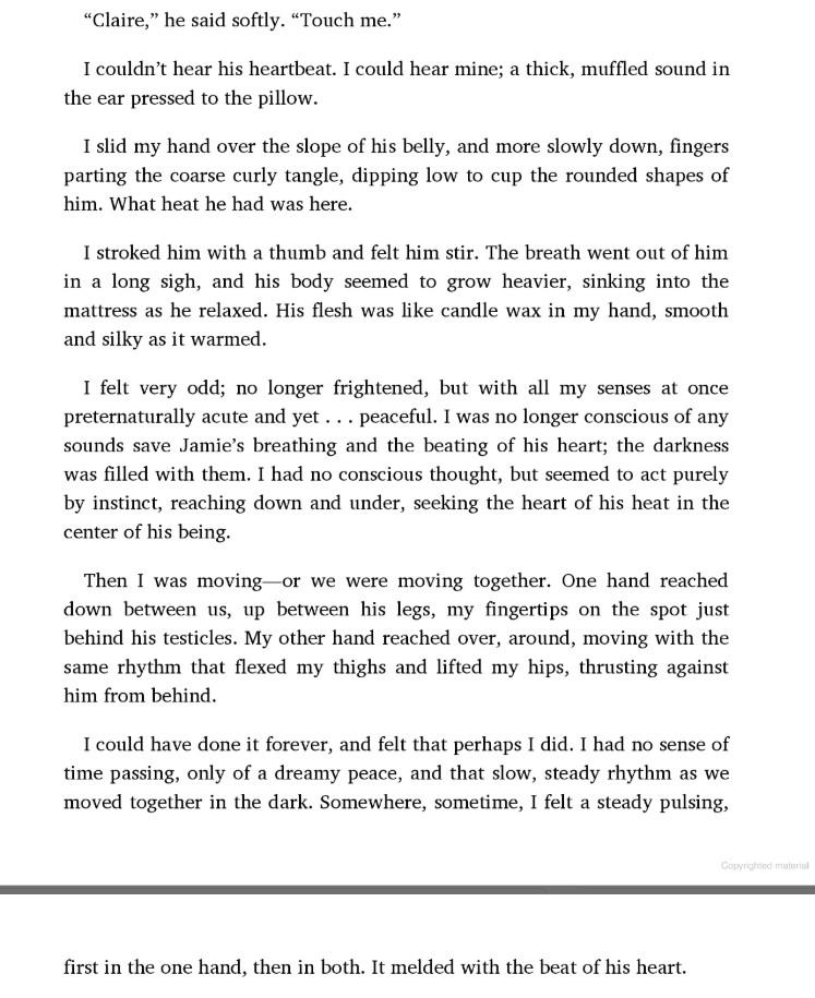 The sequence seems clear. Jamie grows cold. He whispers his last wish—“Touch me before I sleep”—and stops breathing. Unable to find a pulse, Claire does what any good doctor would do: She whips off her nightgown and begins boob-to-boob resuscitation. When that doesn’t defibrillate him, she reaches down and, um, starts stroking. Then, with a gasp, the patient responds, revived via rub and tug. Earlier in the episode, Jamie joked that Claire needed to work on her bedside manner. She seems to have taken his comment to heart (and to hand).
