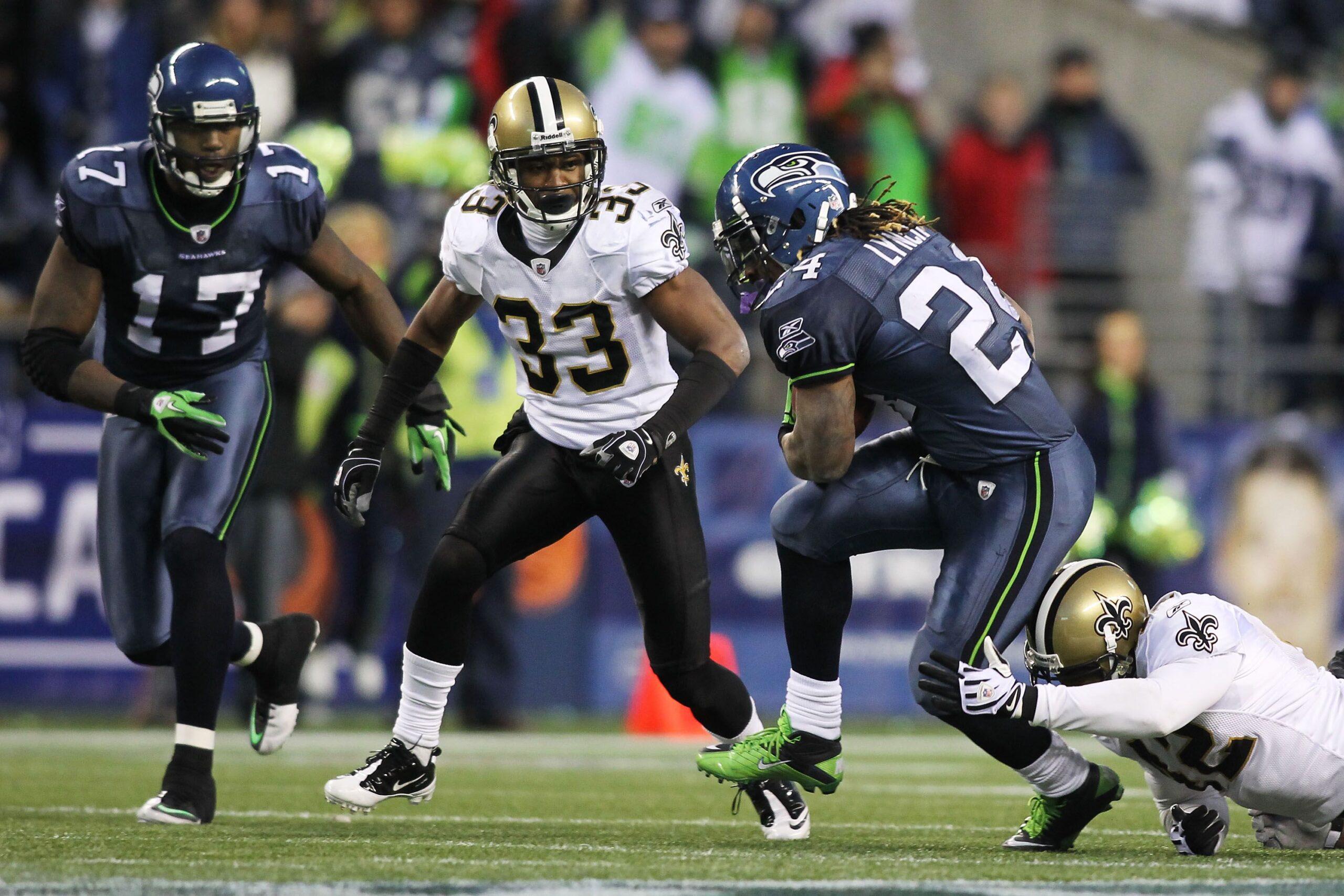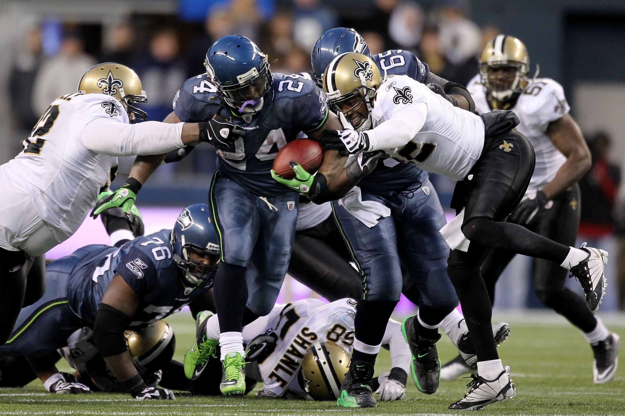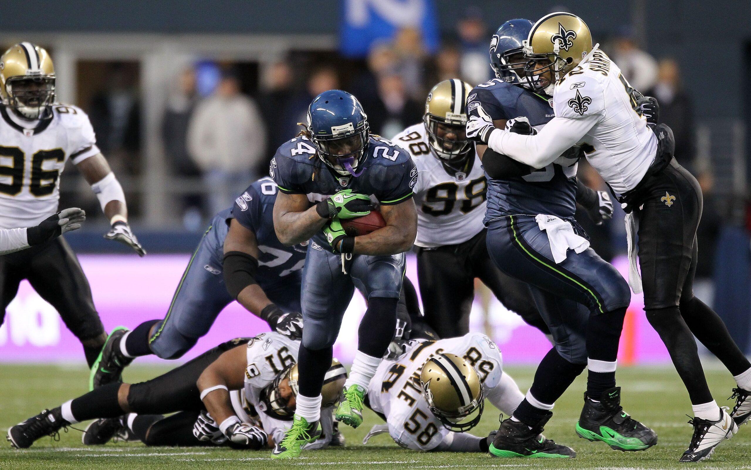 After taking the ball from quarterback Matt Hasselbeck behind the line of scrimmage, Lynch is immediately met in the hole by two defenders. He breaks both tackles as a third defender takes aim at his ankles. Lynch breaks that tackle, too. A fourth defender reaches for Lynch’s right leg while a fifth reaches for his left. Lynch trips, but stays upright. Another cornerback grabs onto Lynch’s waist, but Lynch drags him along until the defender loses his grip. Cornerback Tracy Porter tries to wrap up Lynch in the open field, but Lynch stops and throws Porter off him like a cowboy tossing a man through a saloon window. Two more Saints defenders try for ankle tackles, but, well, you get the idea. Lynch flies into the end zone for a 67-yard touchdown to clinch the upset victory.