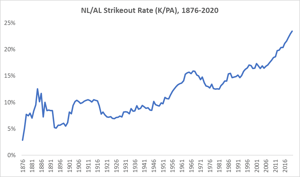 The league’s style of play has become increasingly contact-averse. Hitters struck out in 23.4 percent of all plate appearances last season, more than four times as often as the 5.2 percent rate in 1893. The K rate has climbed slowly but fairly steadily since the beginning of major league baseball, plateauing or receding only when steps were taken to restrain it. Although the latest upward trend has been especially steep and sustained, the addition of the NL DH in 2020 presented a promising opportunity for at least a temporary pause. However, even pulling impotent pitchers out of the batter’s box couldn’t halt the inexorable ascent, which has stretched to a record 15 consecutive seasons.