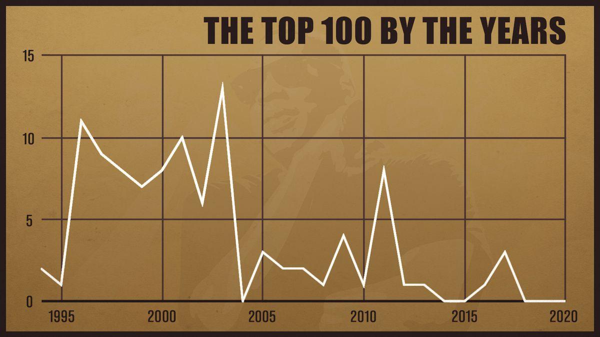 While 1996 still ranks highly, you’ll notice a spike in 2003, which included not only The Black Album, but The Blueprint 2.1, “Crazy in Love,” and his “Pump It Up” freestyle. As fate would have it, Jay’s status appeared to be at an all-time high. And as much as we make fun of him not really retiring with his supposed swan song, he did seem to consider it the perfect time to say goodbye, at least initially, as there are no songs from 2004 on this list. (Jay did, however, give us a handful to choose from that year with the release of the Linkin Park mashup album and his second R. Kelly collaboration. Again, shouts to the voting body for doing the right thing.)