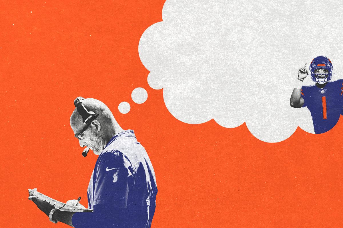 Nagy’s offense looked like it was designed for some other quarterback—any other quarterback—besides Fields. The book on Fields out of Ohio State showed a Russell Wilson–like quarterback. He held on to the ball longer than you’d like, and invited pressure by doing so. He believed unfailingly in his ability to escape that pressure, and took some boneheaded sacks—but he also made some spectacular plays. Fields has a rocket arm and a gorgeous deep ball, and while he was often criticized for birddogging his first read, that criticism wasn’t fair; my charting showed that he got beyond his first read more than any other quarterback in the 2020 class.